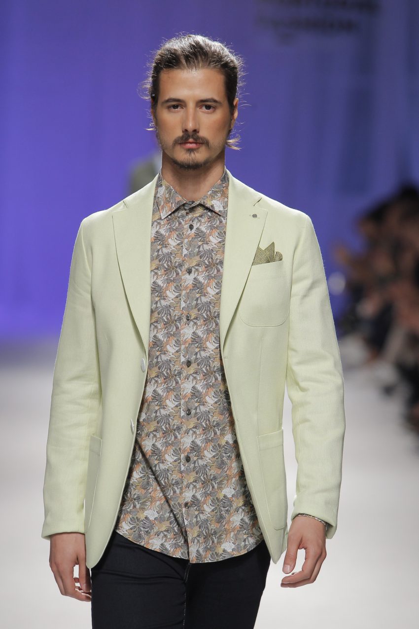 Nos detalhes, os apontamentos surgem em tons de verde militar. Nos padrões predominam os jacquards que levam os estampados para segundo plano, dando um toque mais requintado a todas as tipologias de produtos. O xadrez e as riscas são o must da temporada da forma mais discreta à mais exuberante. As lãs virgens dominam nos fatos. Nos blazers, as misturas de algodão e linho conferem um aspeto fresco e leve aos looks, dos mais estruturados aos mais descontraídos.