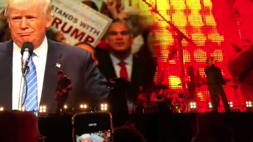 Bono ‘falava’ com Trump, usando vídeos de debates do candidato presidencial. O cantor tocou em vários pontos de vista polémicos do empresário, tal como a construção de um muro na fronteira dos EUA com o México, e depois contra-argumentava.