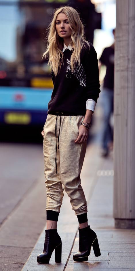 Quanta às calças desportivas, especialmente aquelas com risca branca de lado, voltaram em força e podem ser conjugadas das mais variadas formas: look casual, desportivo ou mais formal.