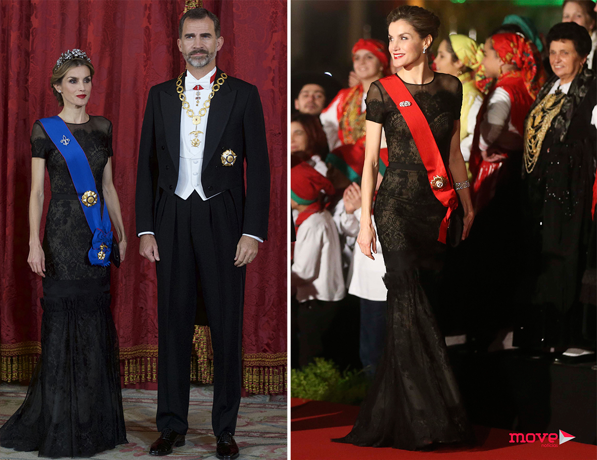 Para o jantar de gala no Paço dos Duques de Bragança, em Guimarães, voltou a recorrer ao que já tinha no seu guarda-roupa. O vestido preto, justo, com rendas e transparências de Carolina Herrera que já tinha usado no seu primeiro jantar de Estado como rainha em Madrid, em outubro de 2014. À exceção de que há dois anos usou tiara.