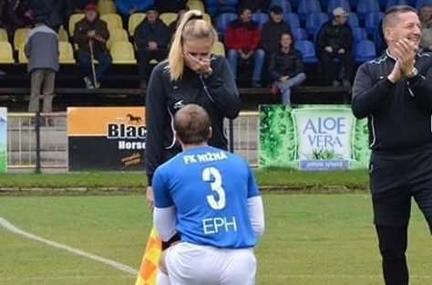 Quando os jogadores estavam todos alinhados, no relvado, com a restante equipa de arbitragem, Lubomir Vajecka, camisola 3 do FK Nizna, foi ter com a sua namorada, fiscal de linha, e pediu-a em casamento.