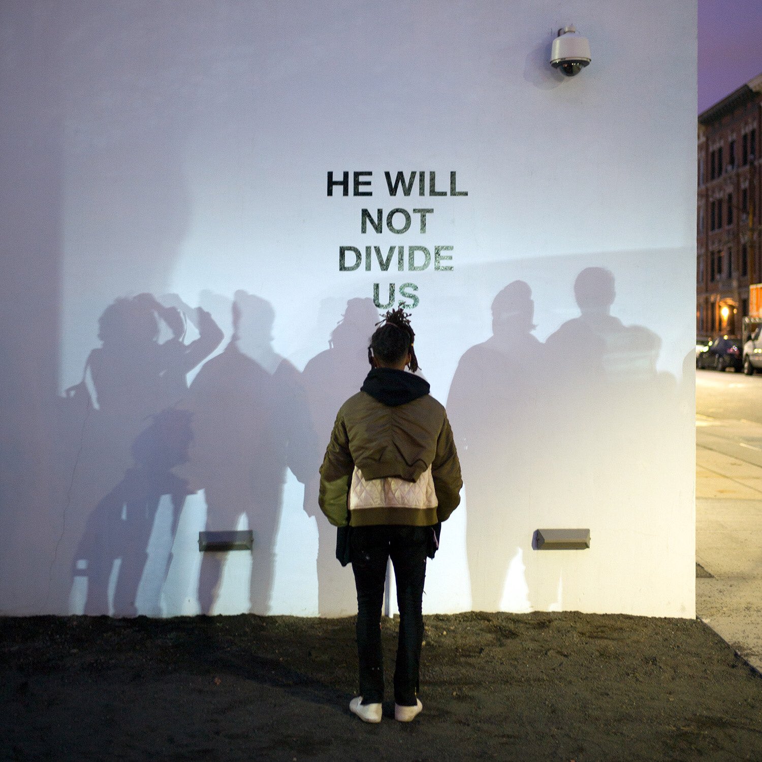 “Aberto a todos, 24 horas por dia, sete dias por semana, o desempenho participativo será transmitido ao vivo continuamente por quatro anos.” Esta é a premissa do projeto do ator que convida o público a dizer, para a câmara de filmar, a frase “He Will Not Divide Us” (“Ele não nos irá dividir” ou que pode ser entendido também como “Ele não irá dividir US/Estados Unidos).