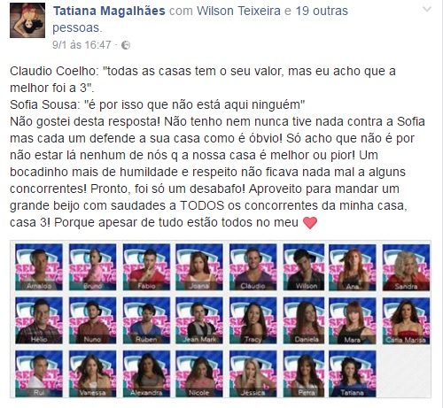 Mas não é tudo. Tatiana Magalhães, noiva do vencedor da CdS 3, Rúben Boa Nova, também apanhou Sofia Sousa a atacar a generalidade dos participantes da sua Casa. Não gostou do que ouviu, divulgou e reagiu.