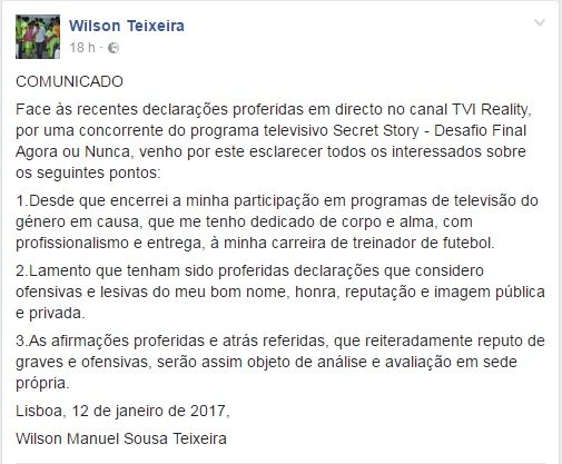 Essas palavras chegaram aos ouvidos do visado. Wilson Teixeira defendeu-se publicamente através de um comunicado partilhado no Facebook, no qual, sem clarificar, deixa nas entrelinhas a possibilidade de agir judicialmente sobre Sofia Sousa.