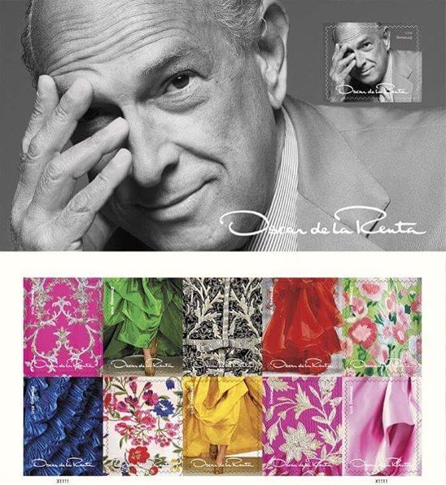 Agora, o Serviço Postal dos EUA (uma espécie de CTT) decidiu homenageá-lo com uma série de selos, especialmente criados para o efeito. Nalguns aparece a cara de La Renta em preto e branco (uma fotografia de Inez van Lamsweerde e Vinoodh Matadin), noutros alguns dos seus vestidos mais conhecidos (desenhados para este propósito pelo diretor de arte Derry Noyes).