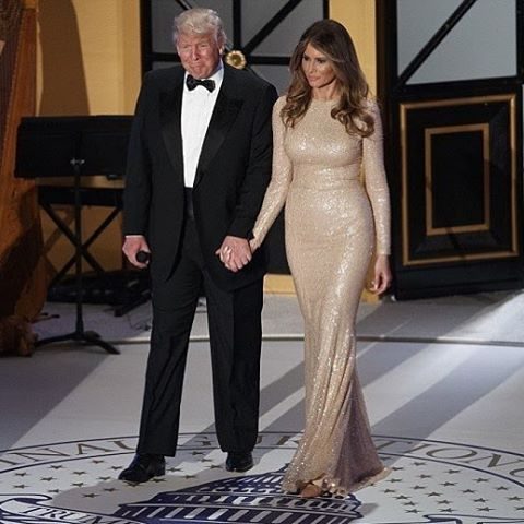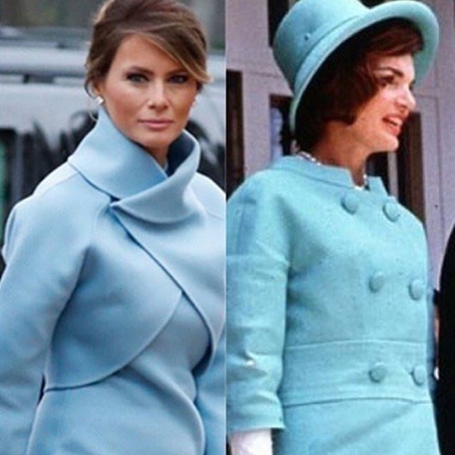A mulher de Donald Trump optou por um vestido, casaco e luvas azuis desenhadas em exclusivo para si pelo estilista norte-americano Ralph Lauren. Também aqui está a fazer lembrar a antiga Primeira-Dama Jacqueline Kennedy, na altura em que aquela se tornou um ícone da moda ao olhos do mundo.