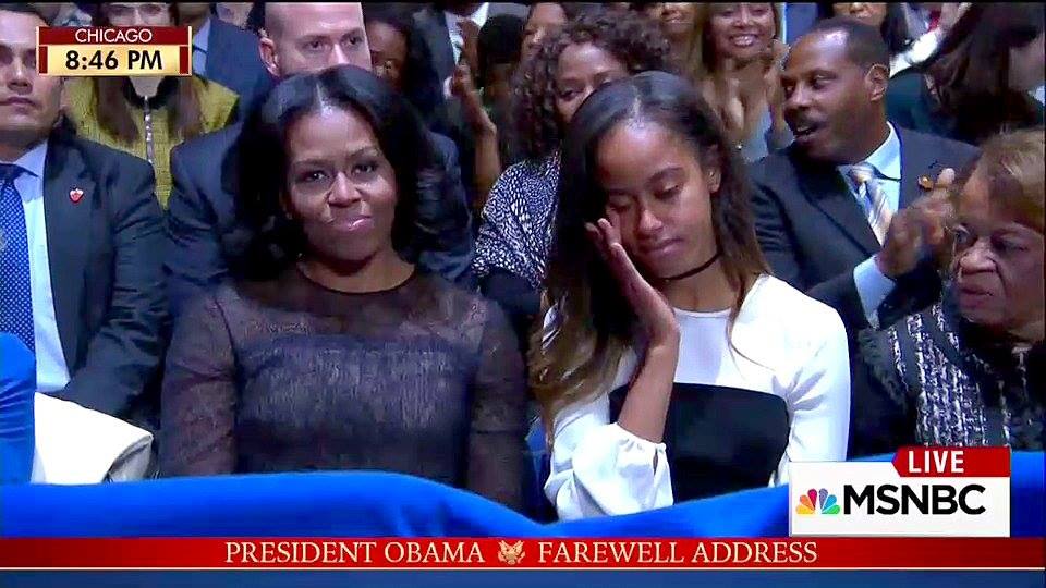 Foi a ausência mais notada da noite. A filha mais nova do casal Obama não esteve ao lado da família no adeus à Presidência dos EUA. Uma despedida pautada pela emoção, onde Barack, Michelle, Malia e as cerca de 18 mil pessoas na audiência em Chicago tiveram de limpar as lágrimas.