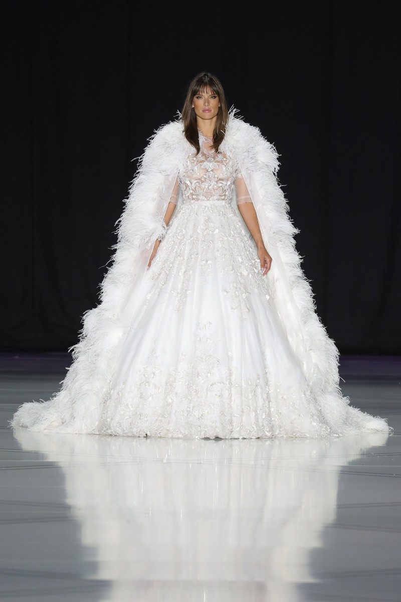 Não é só o branco a dominar a passerelle. Também há em rosa e tons dourados. Com plumas, mais esvoaçantes, estilo princesa ou arrojados, há de tudo.