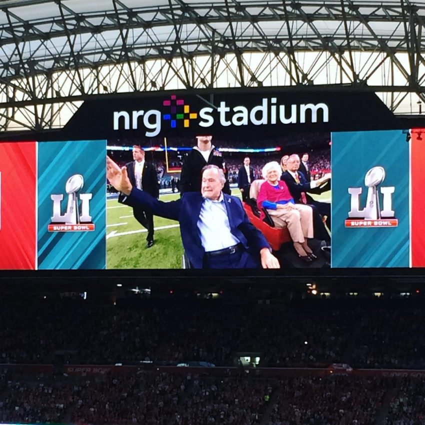 O antigo casal presidencial George e Barbara Bush, que já recuperou depois de ter estado internado, lançou a moeda que sorteou a saída de bola de New England Patriots x Atlanta Falcons. George, de cadeira de rodas, e a mulher foram muito aplaudidos no estádio.