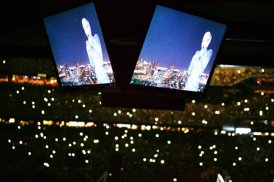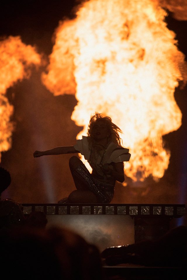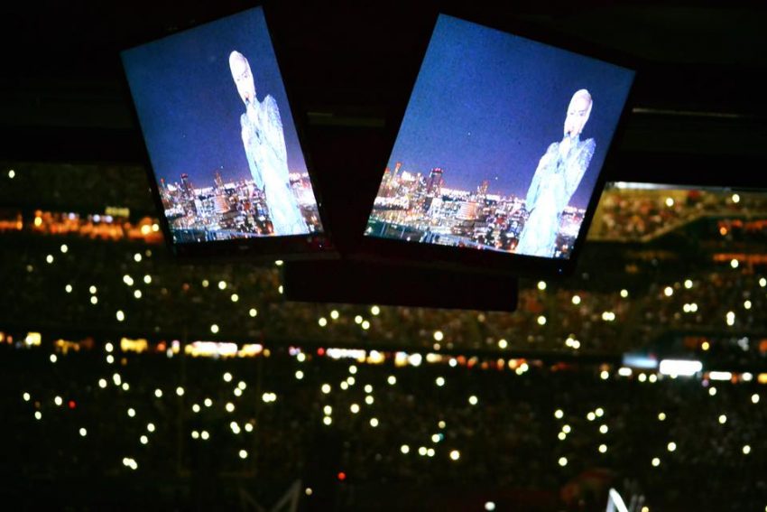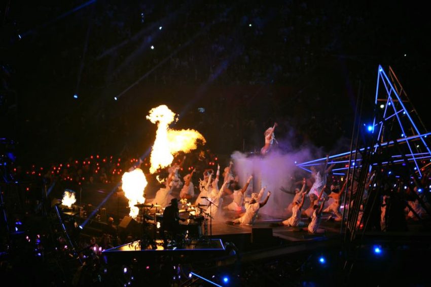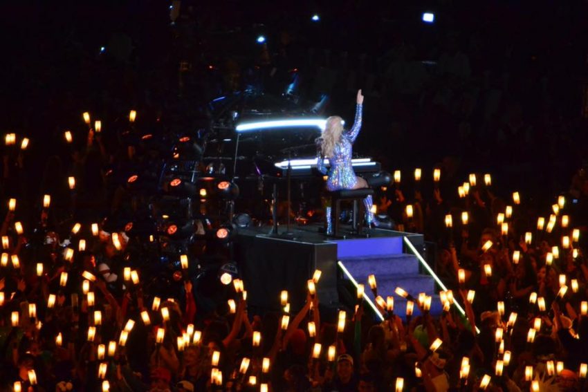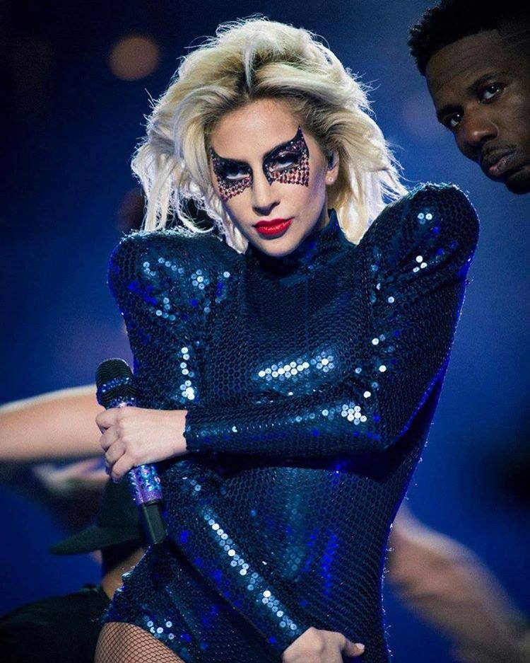 Depois saltou para a arena do Super Bowl, pendurada em cabos de aço. Seguiram-se hits como ‘The Edge of Glory’, ‘Poker Face’ e ‘Just Dance’.