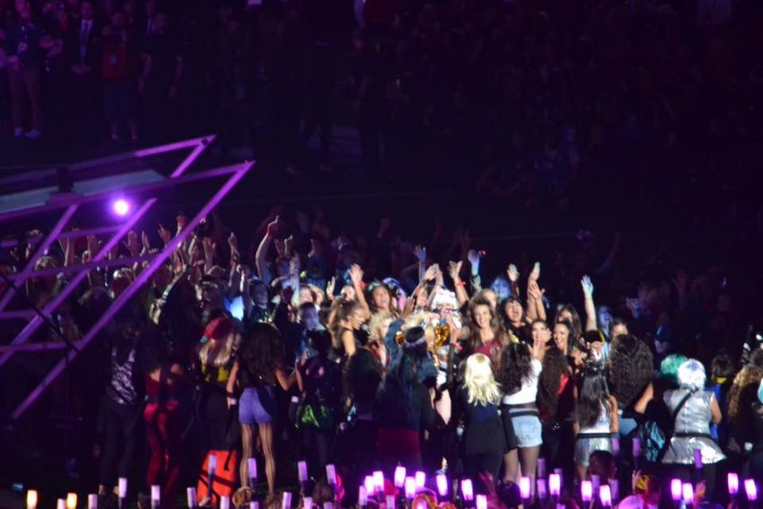 Também abraçou uma jovem afro-americana do público enquanto cantava “stay” (fica), o último verso da sua nova canção ‘Million Reasons’, a qual interpretou ao piano.