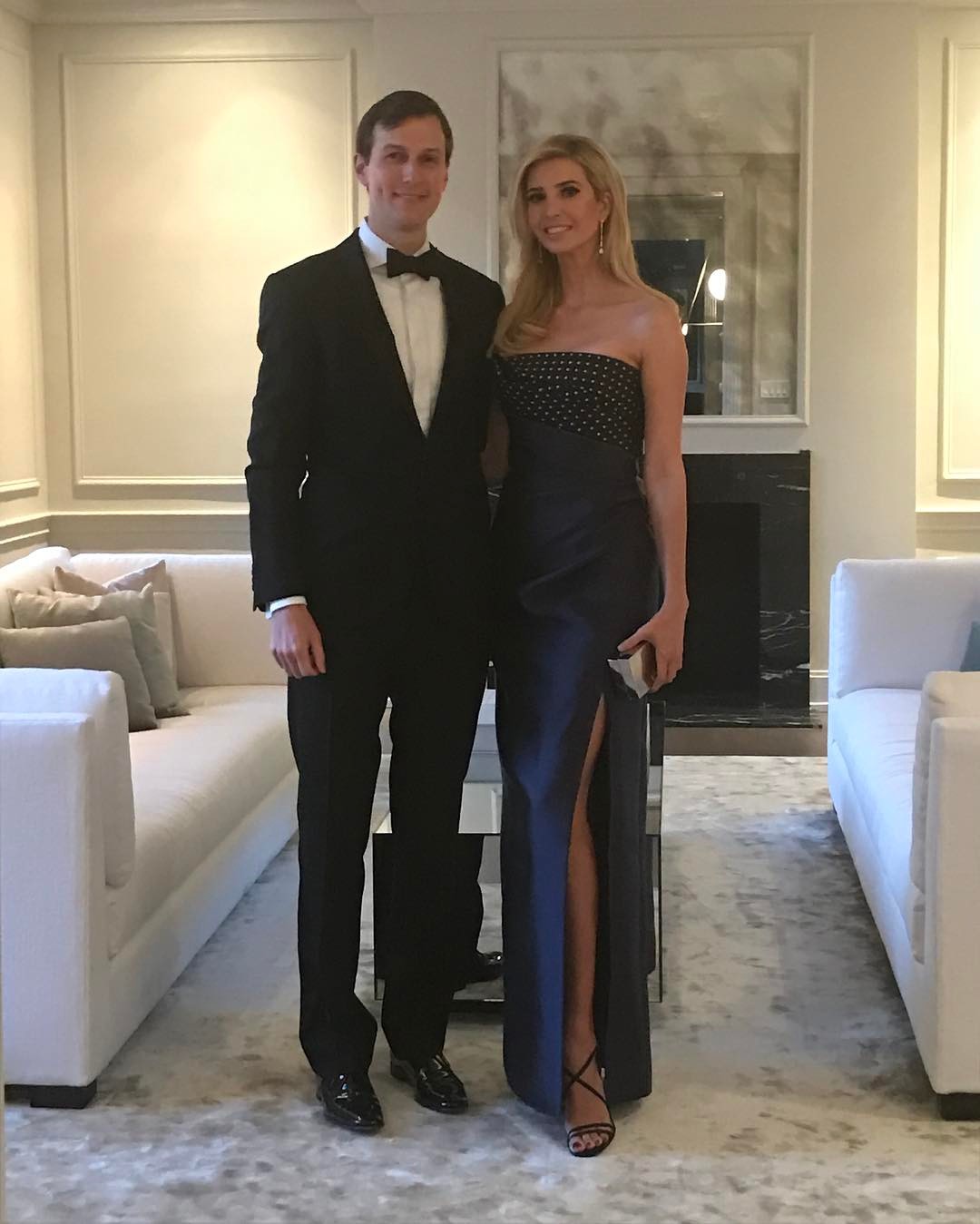 Ivanka escolheu um vestido de cetim em tom azul noite, da autoria de J. Mendel, no valor de 4000 euros. O visual foi abrilhantado por uma pochette metalizada e umas sandálias pretas da sua marca. O modelo de calçado teve grande destaque, sobretudo após a empesária ter deixado de estar à frente da marca, que estava a sofrer quebras de vendas por ter o seu nome associado.