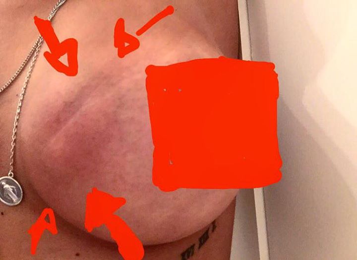 A imagem foi tirada em dezembro de 2015 antes dos tratamentos e percebe-se bem a deformação que a doença provoca na mama.