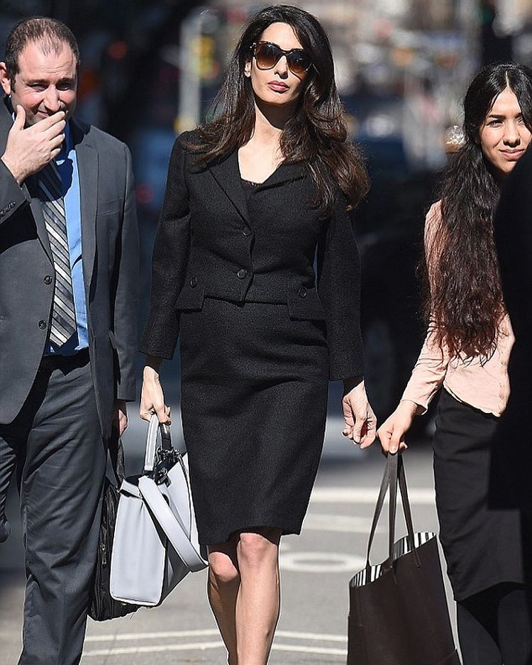 Recentemente Amal foi fotografada, igualmente, à entrada do edifício da ONU com um look preto que deixava ver a barriga. Veja as fotos: