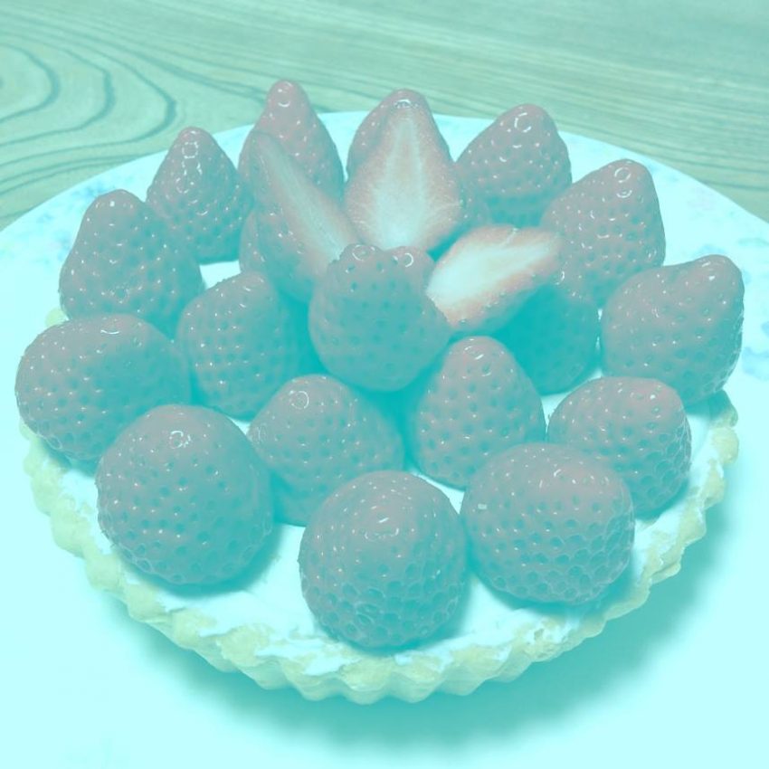 Partimos com base nesta imagem de um bolo de morangos, onde apesar de ter um tom azulado, vemos o vermelho dos morangos. Certo? Errado.