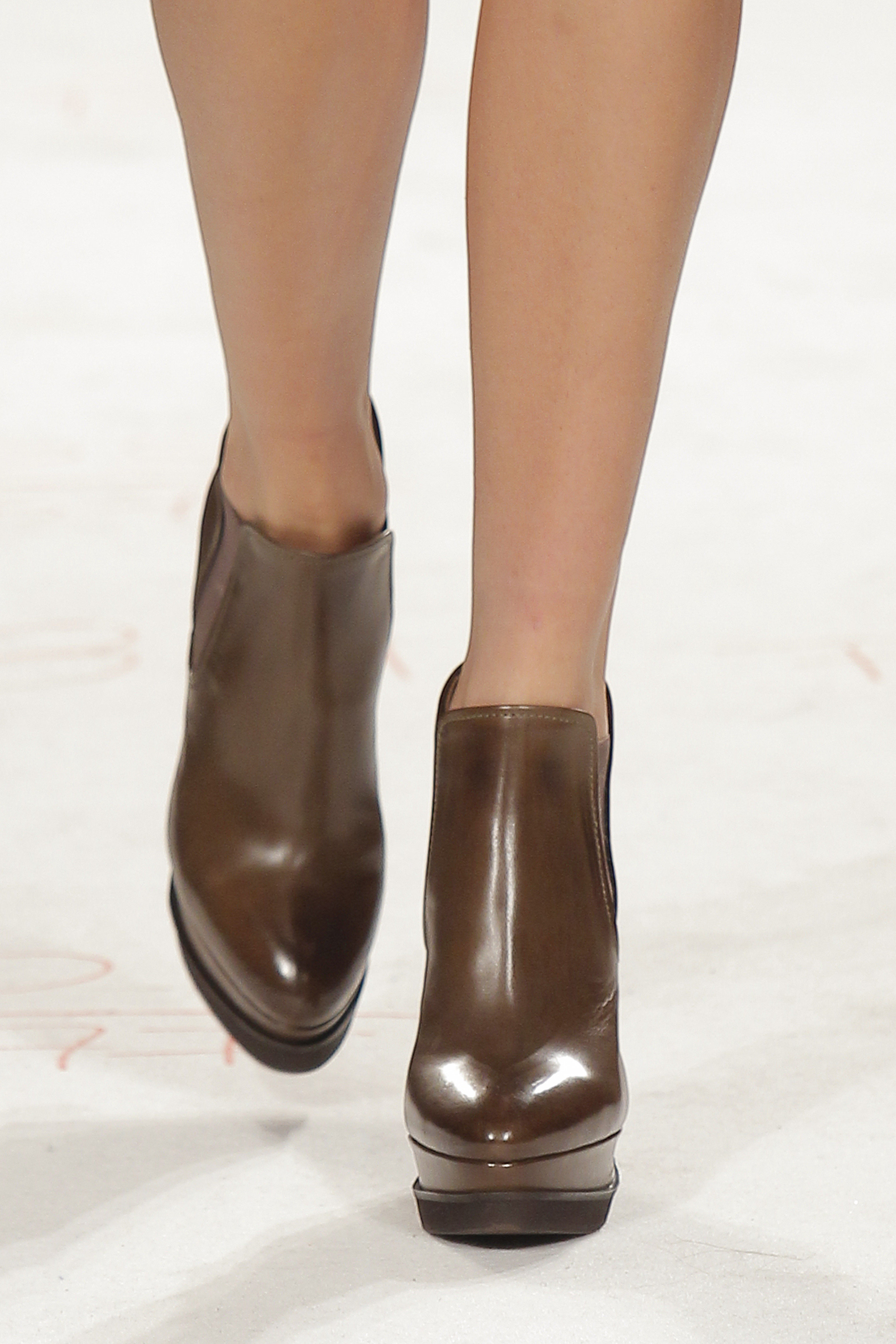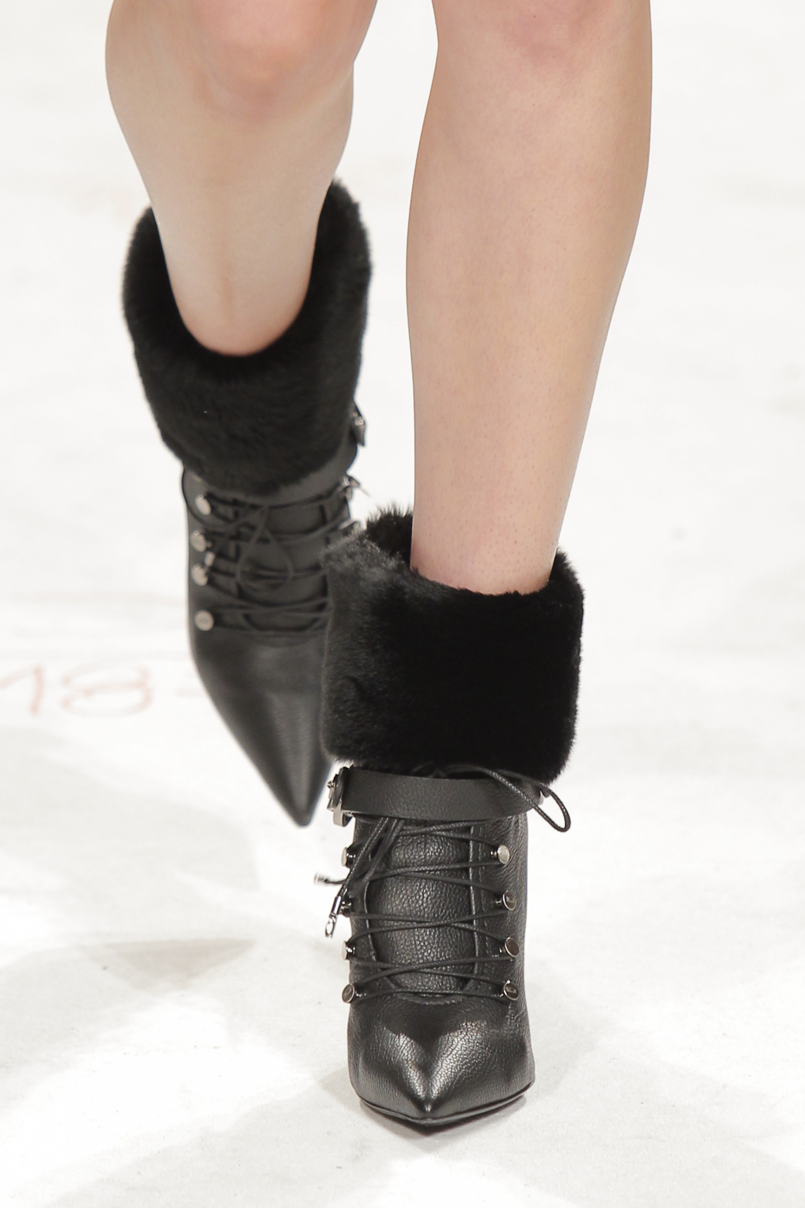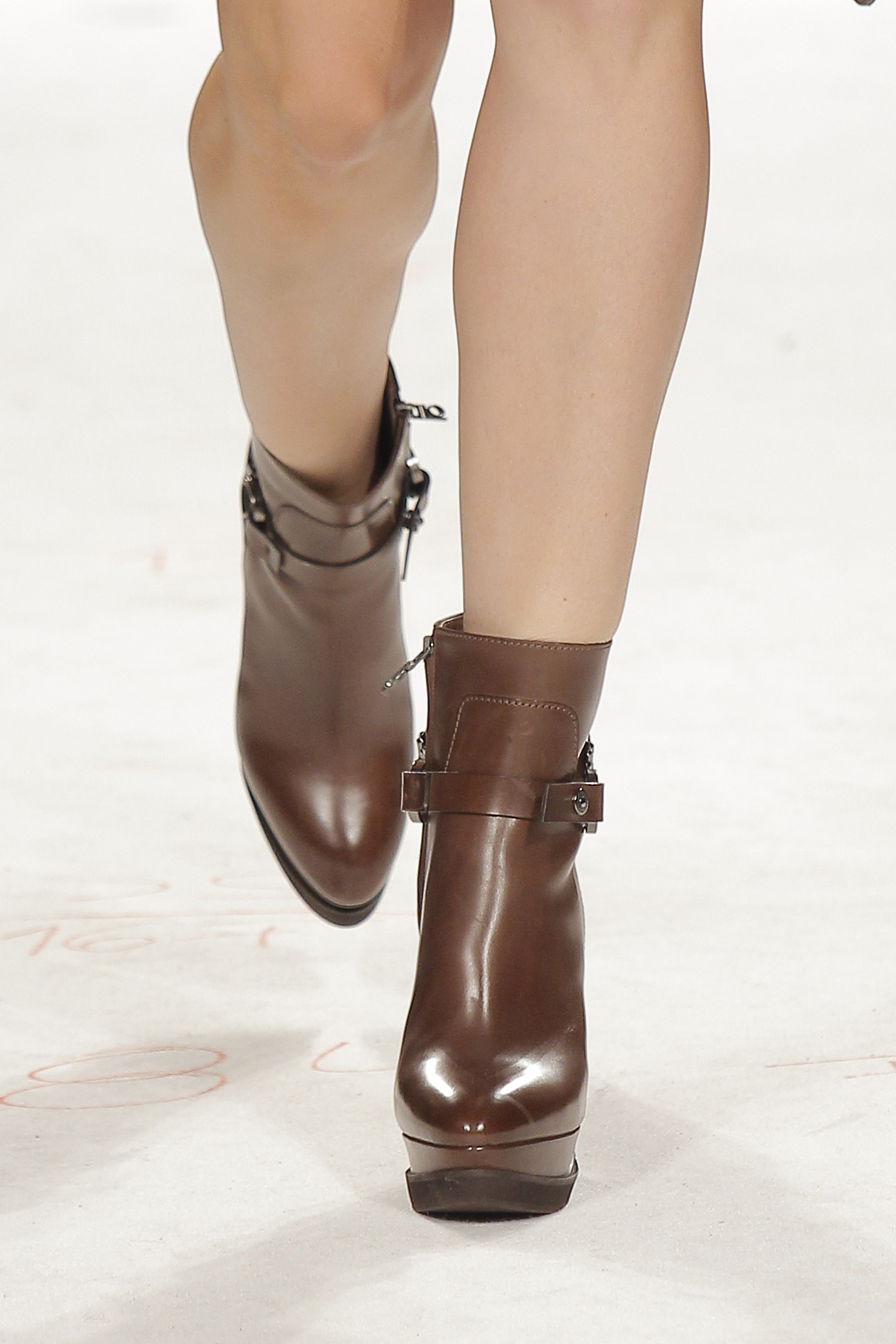 As botas de montar regressam como um clássico renovado, cujas solas e canos incorporam pedras e metais que se complementam com canelados nas laterais. Correntes, tachas e outros acessórios metálicos surgem replicados dos anos 70 e desafiam a gravidade. O efeito modelador da Lycra traz feminilidade em botins e botas acima do joelho.