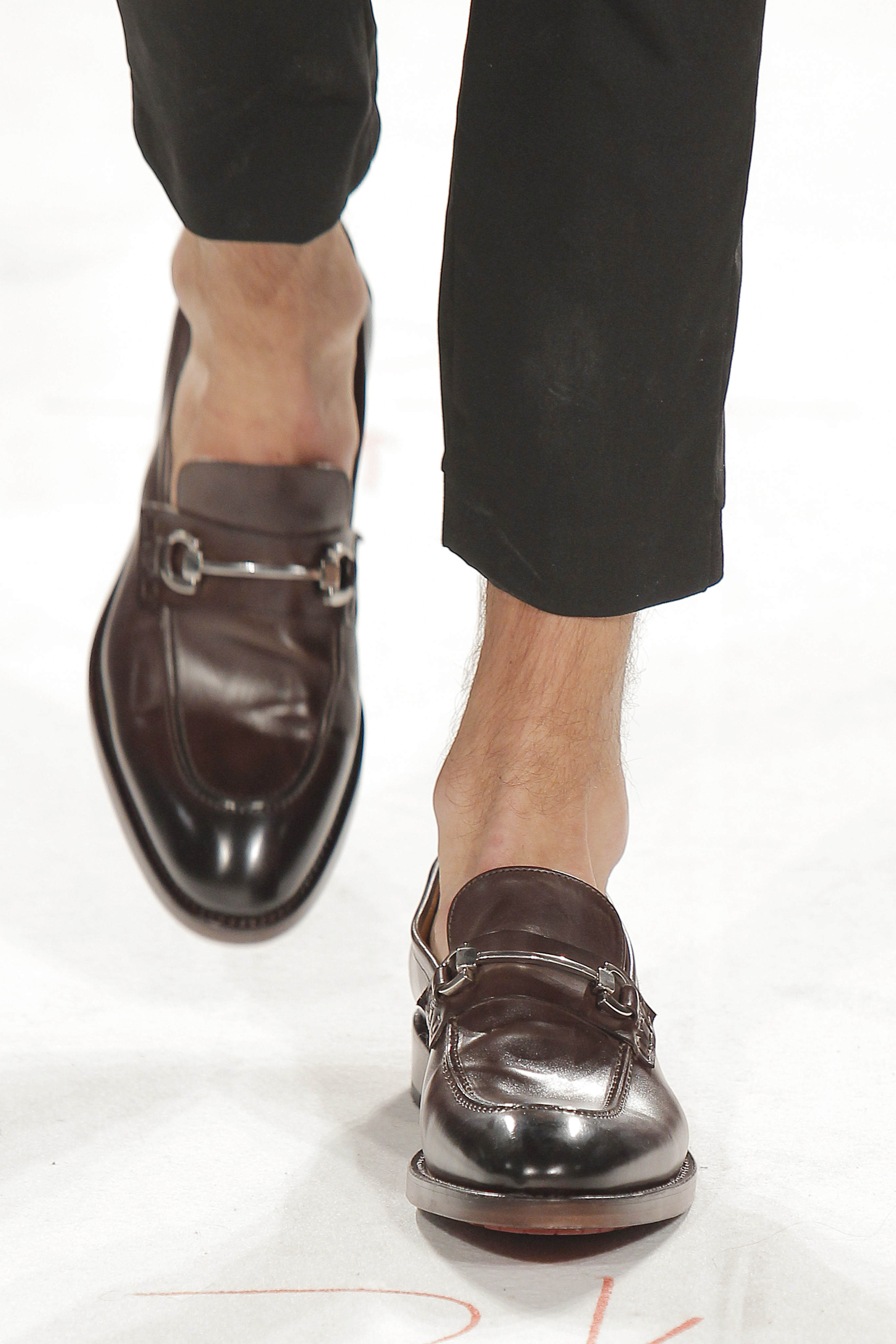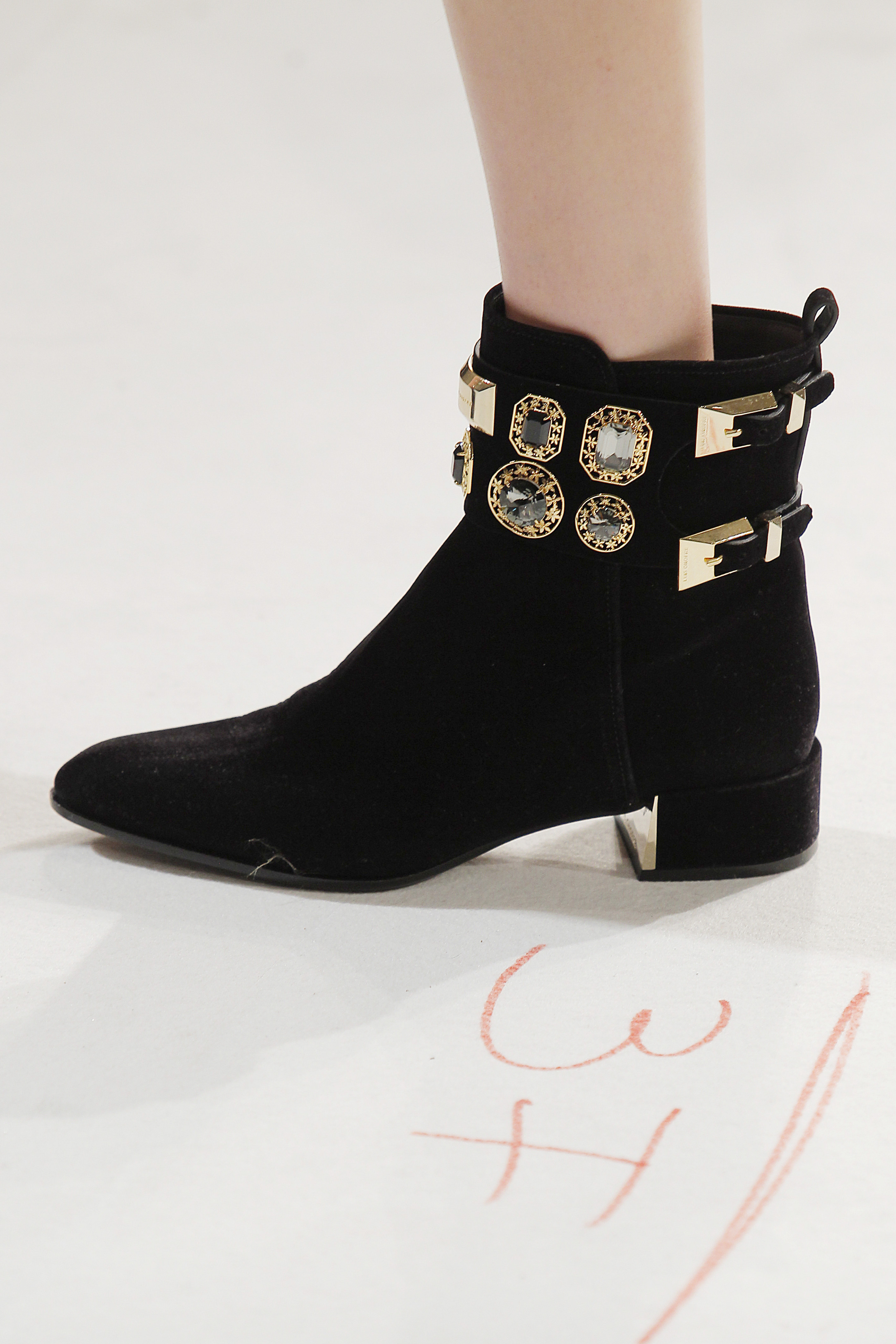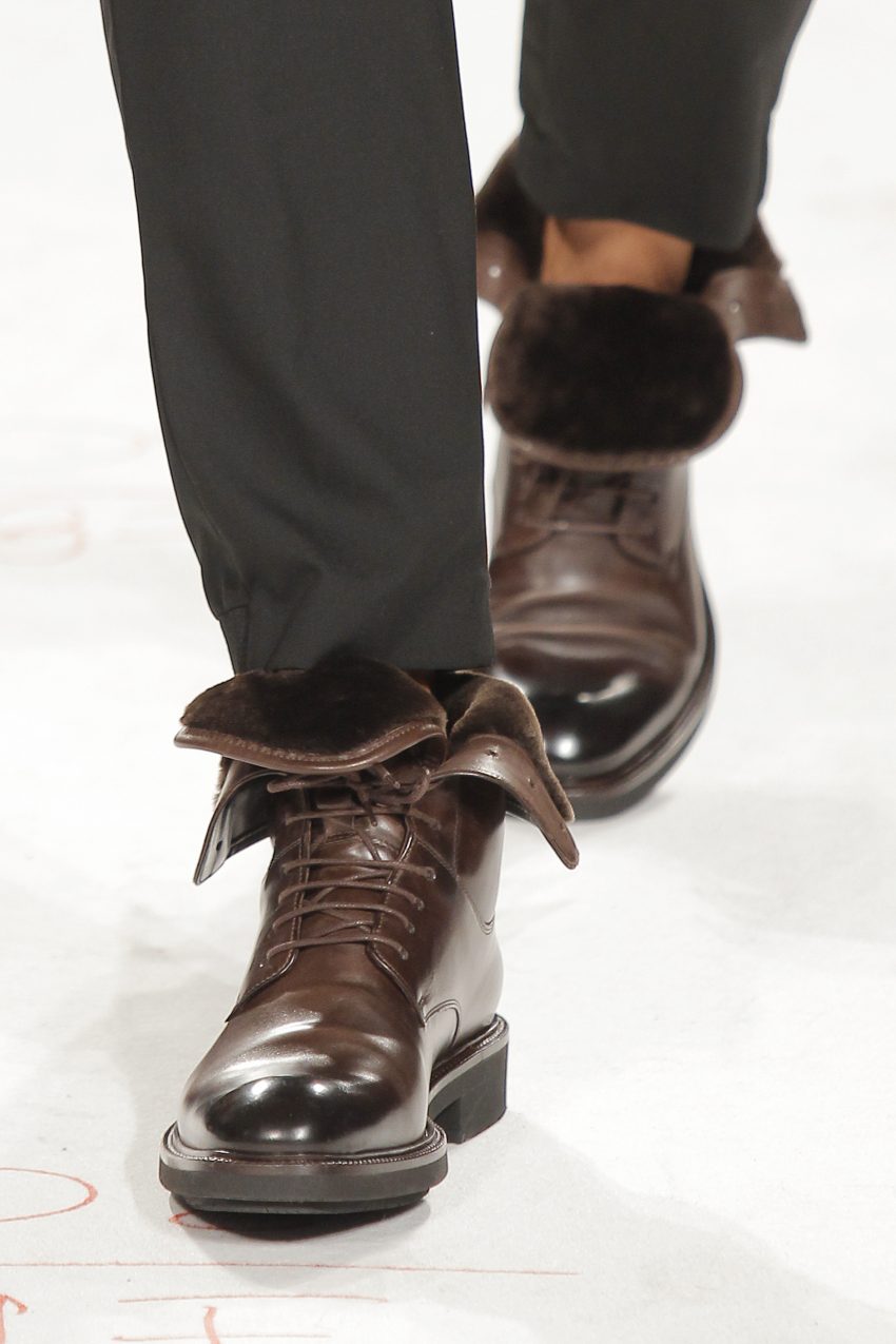 As botas de montar regressam como um clássico renovado, cujas solas e canos incorporam pedras e metais que se complementam com canelados nas laterais. Correntes, tachas e outros acessórios metálicos surgem replicados dos anos 70 e desafiam a gravidade. O efeito modelador da Lycra traz feminilidade em botins e botas acima do joelho.