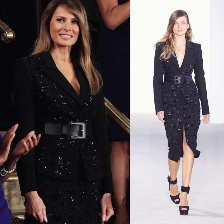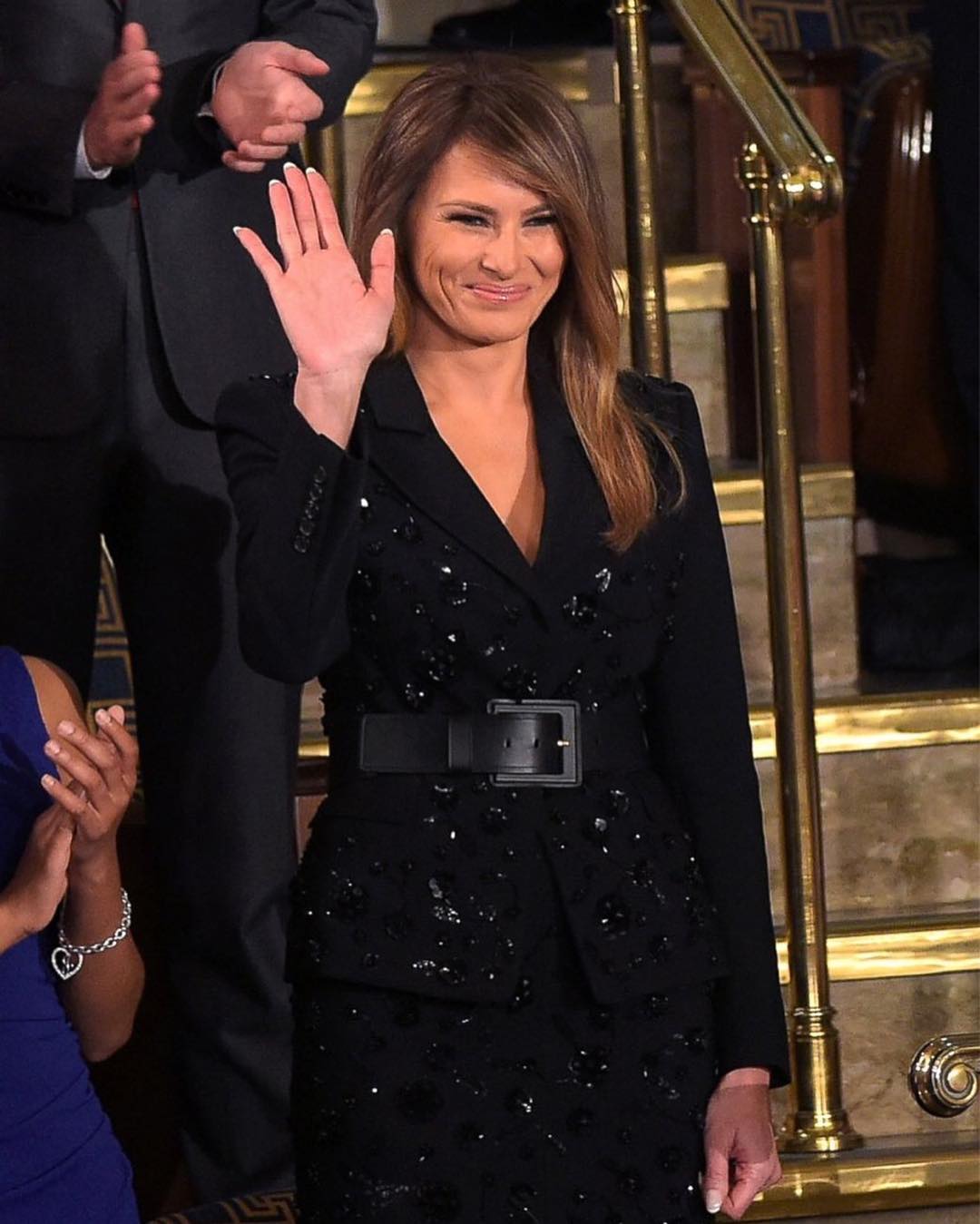 Mesmo assim, há já quem considere este o melhor look de Melania Trump. Trata-se de um casaco e uma saia com lantejoulas, de Michael Kors, que aquela usou no primeiro discurso do marido no Congresso, esta terça-feira, em Washington D.C.