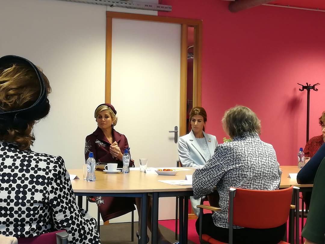 A rainha Máxima, que nasceu naquele país sul-americano, optou por um conjunto de casaco e saia “Coppens Lelies” da marca holandesa de luxo Mattijs van Bergen.