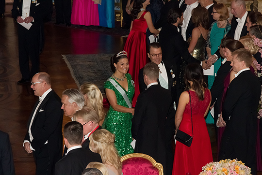 Os reis, os príncipes herdeiros, Victoria e Daniel, e os príncipes Carl Philip e Sofia receberam na sala Mar Branco os vários convidados, entre diplomatas, políticos, empresários e personalidades do desporto e da cultura que aqueles conhecem durante as suas viagens oficiais.