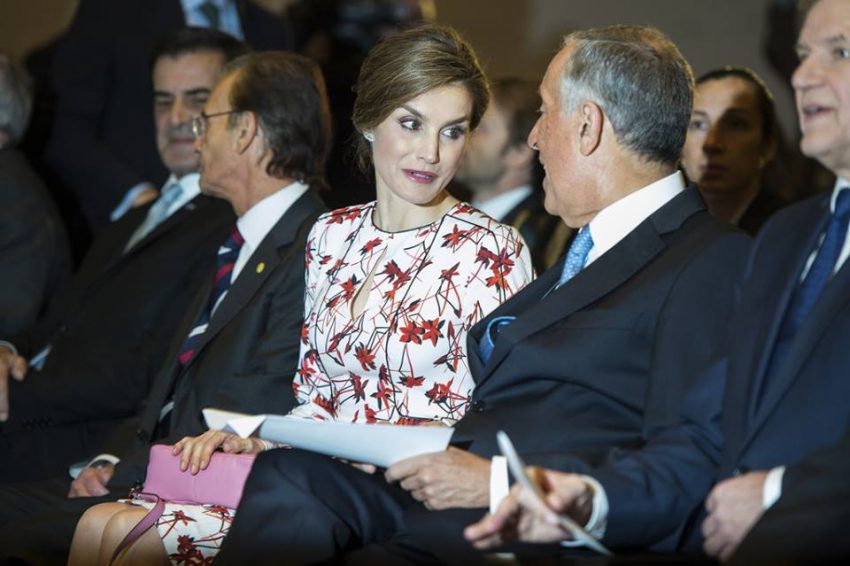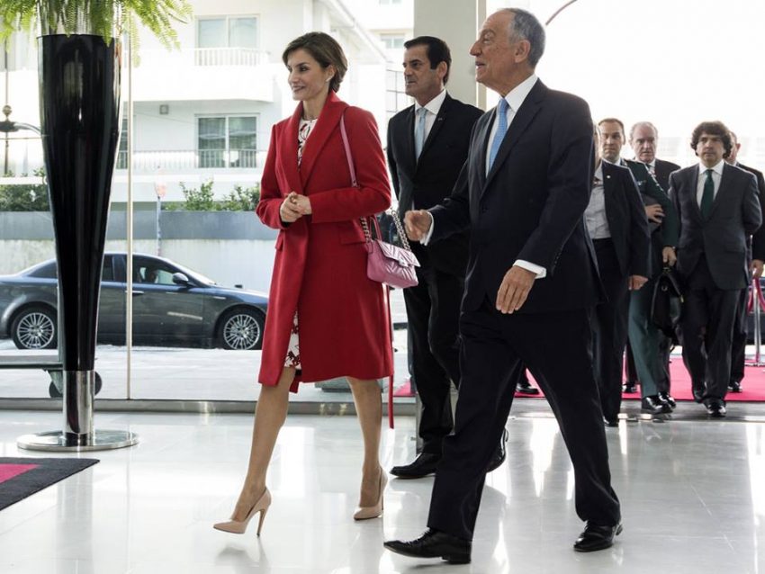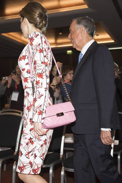 O único adereço que a monarca estreou foi uma carteira de alças, em rosa, da Uterqüe e que custa 129 euros.