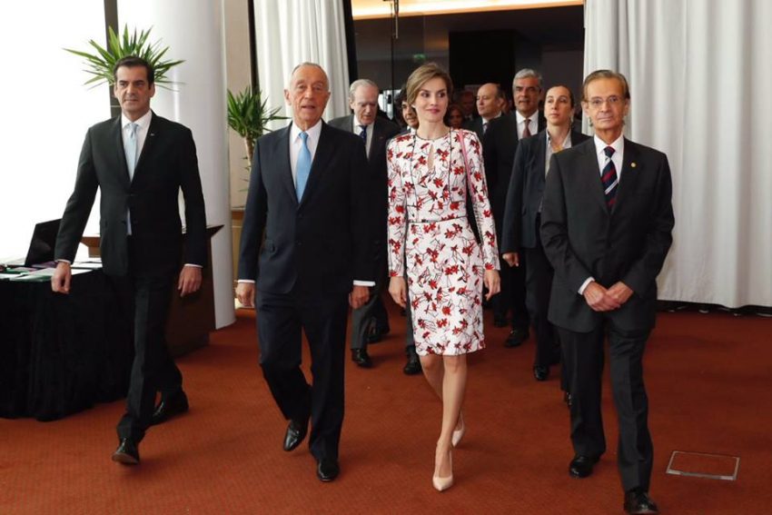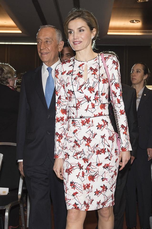 A rainha Letizia usou um vestido branco, de manga comprida e um pequeno decote em lágrima com flores vermelhas estampadas. Trata-se de uma criação de Carolina Herrera New York, pertence à coleção outono de 2016 e custa mais de 5 mil euros.