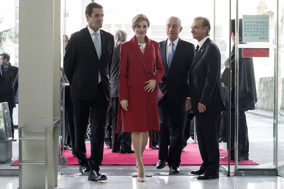 À chegada ao Sheraton Porto – Hotel SPA, levava um casaco vermelho de Hugo Boss. Os sapatos de salto alto nude são da Lodi e os brincos, em forma de pluma em ouro branco e diamantes, da Chanel. Estes custam 6400 euros e são da coleção ‘Plume’ da maison francesa.