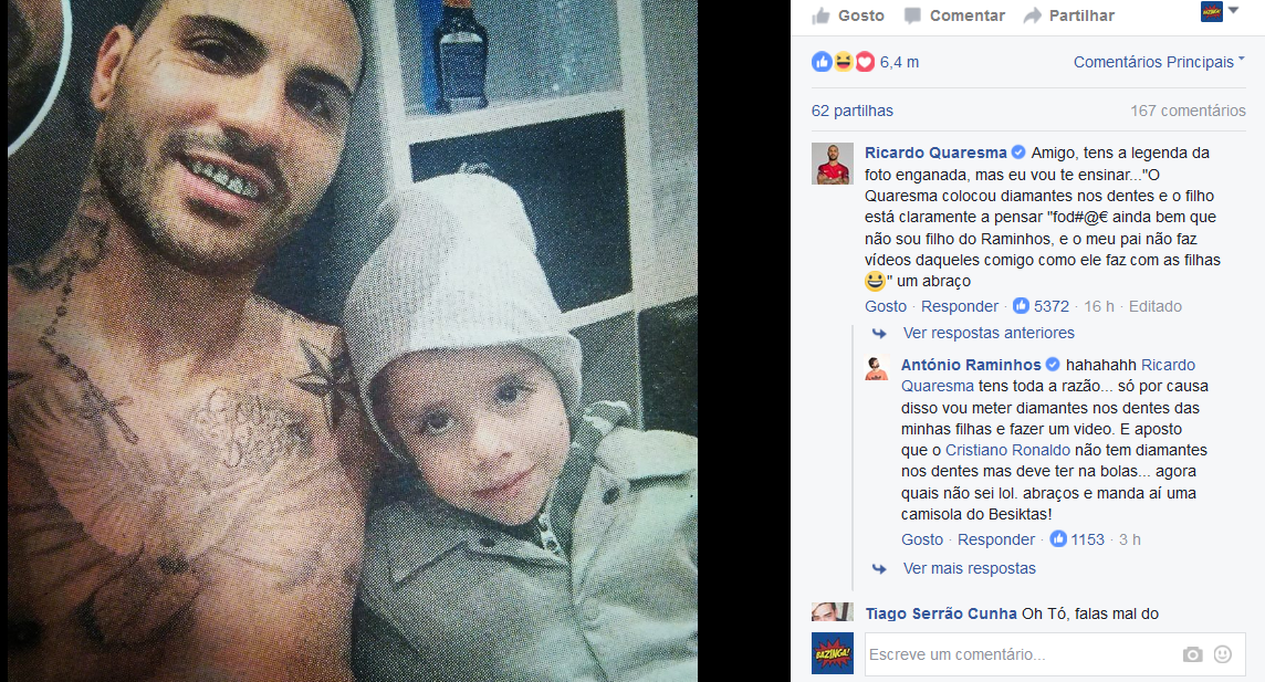 “Amigo, tens a legenda da foto enganada, mas eu vou te ensinar…”O Quaresma colocou diamantes nos dentes e o filho está claramente a pensar “fod#@€ ainda bem que não sou filho do Raminhos, e o meu pai não faz vídeos daqueles comigo como ele faz com as filhas :D” um abraço”, respondeu o futebolista na página de Facebook do humorista.
