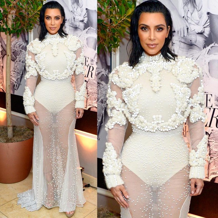 A promessa foi cumprida e causou furor desde a sua chegada à gala. O vestido comprido, de cor branca, destacava-se pelas transparências e brilho, evidenciando a silhueta tão célebre da mulher do rapper Kanye West. Além disso, as semelhanças entre este novo modelo e o seu vestido de noiva foram bastante evidentes.
