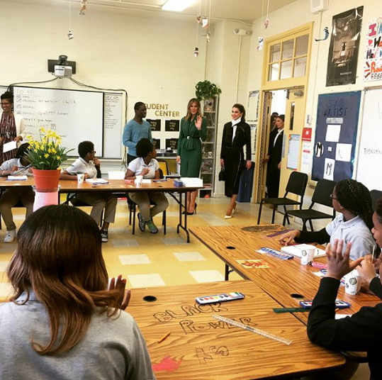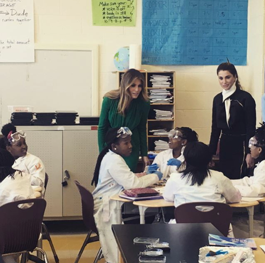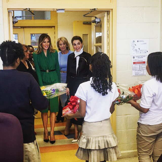 Enquanto Donald Trump e o rei Abdullah II falavam na Sala Oval sobre a crise humanitária e política na Síria e a melhor forma de combater o Estado Islâmico, as respetivas mulheres puderam visitar a primeira escola pública de uma zona pobre de Washington para meninas desde a pré-escola até ao 8º ano.