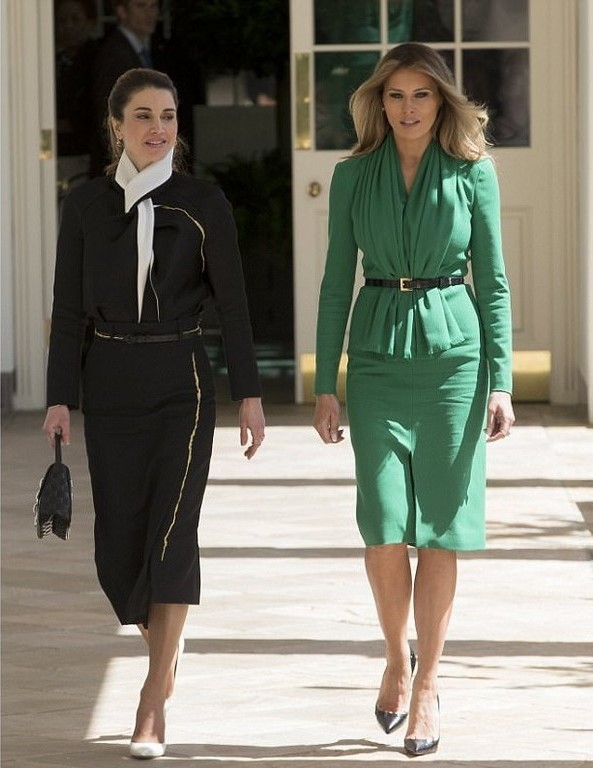 A antiga modelo eslovena optou novamente por um look Hervé Pierre, o mesmo designer francês que a vestiu para o baile da tomada de posse (na altura o vestido branco chamou a atenção pela sua elegância e deixou o estilista mais mediático). O vestido era verde, ao passo que Rania usava um ‘outfit’ preto e branco. Veja as fotos: