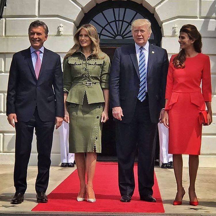 Enquanto Melania escolheu um look militar que não convenceu os fãs na internet, a sua homóloga argentina ofuscou-a com um vestido vermelho.