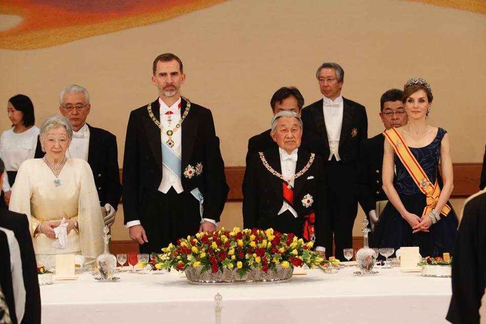 No jantar de gala, oferecido pelos Imperadores Akihito e Michiko, Doña Letizia surgiu com um vestido azul, com bordados e cristais, de Felipe Varela, que já tinha estreado no verão de 2015. Levava uma tiara floral e uma pulseira da Cartier.