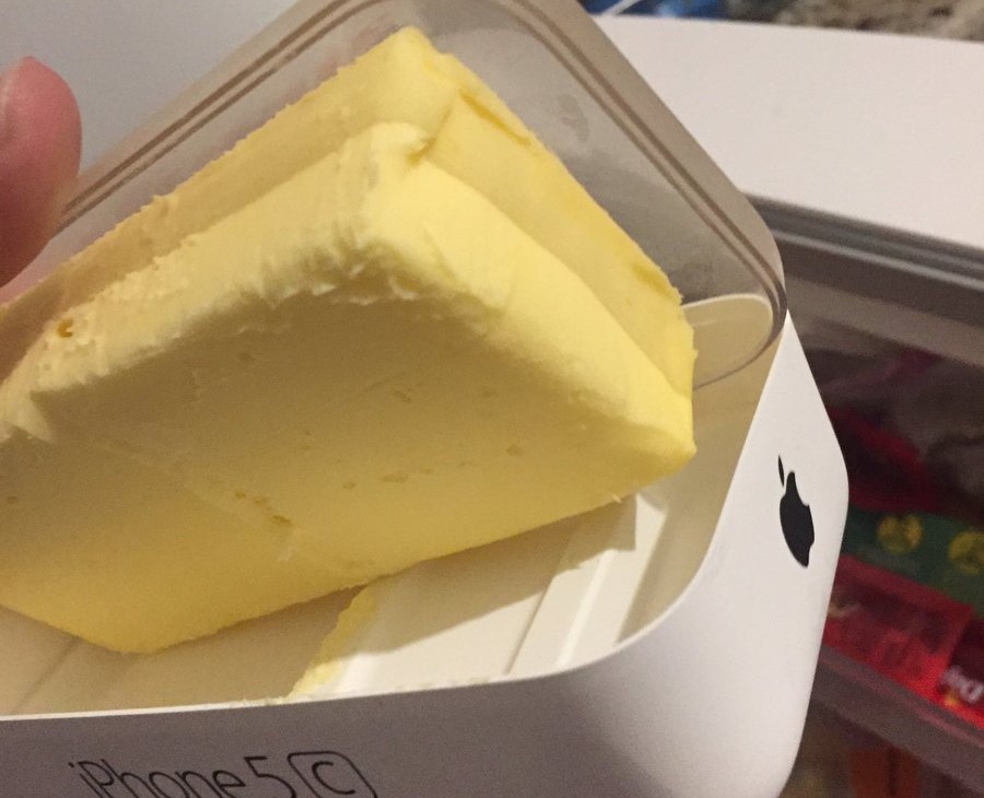 A mulher, brasileira, encontrou a caixa do iPhone 5 do neto e achou que dava um perfeito recipiente para guardar a manteiga. Sim, verdade.