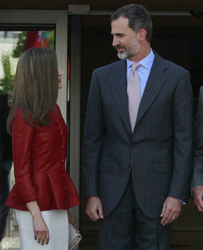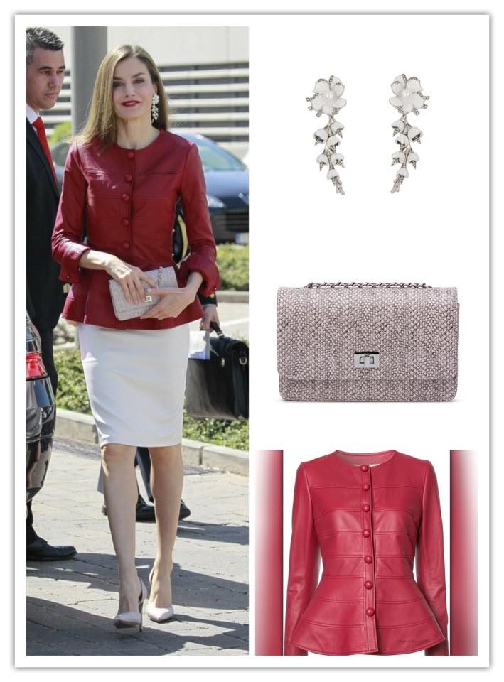 Para este evento, a rainha Letizia optou por usar um casaco novo de couro vermelho Carolina Herrera (448 euros), uma saia Hugo Boss que já tinha (190 euros), sapatos de salto alto Magrit com estampado de serpente, em tom nude. Este calçado foi estreado na visita oficial ao Japão, no mês passado.