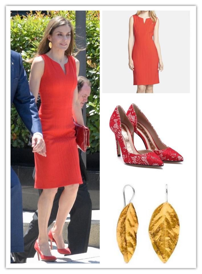 Surgiu com um vestido vermelho Hugo Boss, modelo Daladi, e os mesmos sapatos de salto Magrit do dia anterior, ainda que numa cor diferente. A monarca estreou uns brincos Tous, feitos em prata banhada em ouro, com a forma de folha, que pertencem à coleção Laure e custam 59 euros. Levou ainda uma clutch Carolina Herrera, modelo Mayba, em pele de píton com um toque de dourado, que já fazia parte do seu ‘closet’.