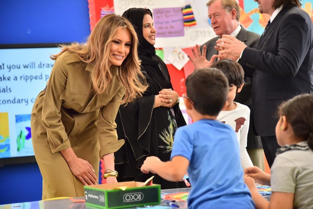 Depois a Primeira-Dama esteve na Escola Internacionald de Riade com um vestido verde tropa e um cinto grande, que tem sido a sua imagem de marca.