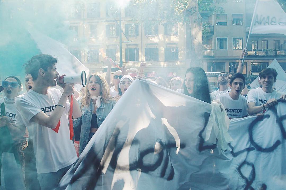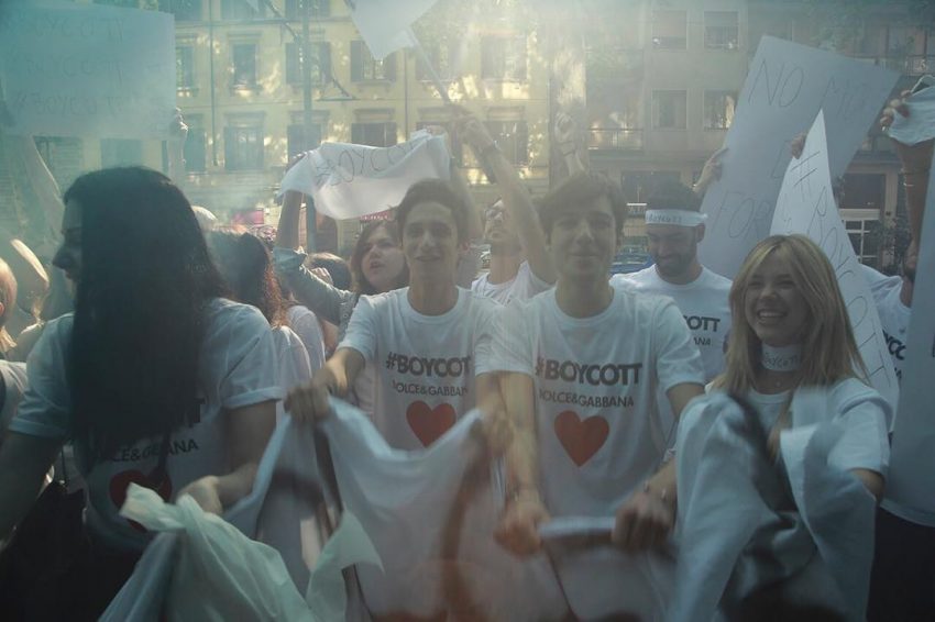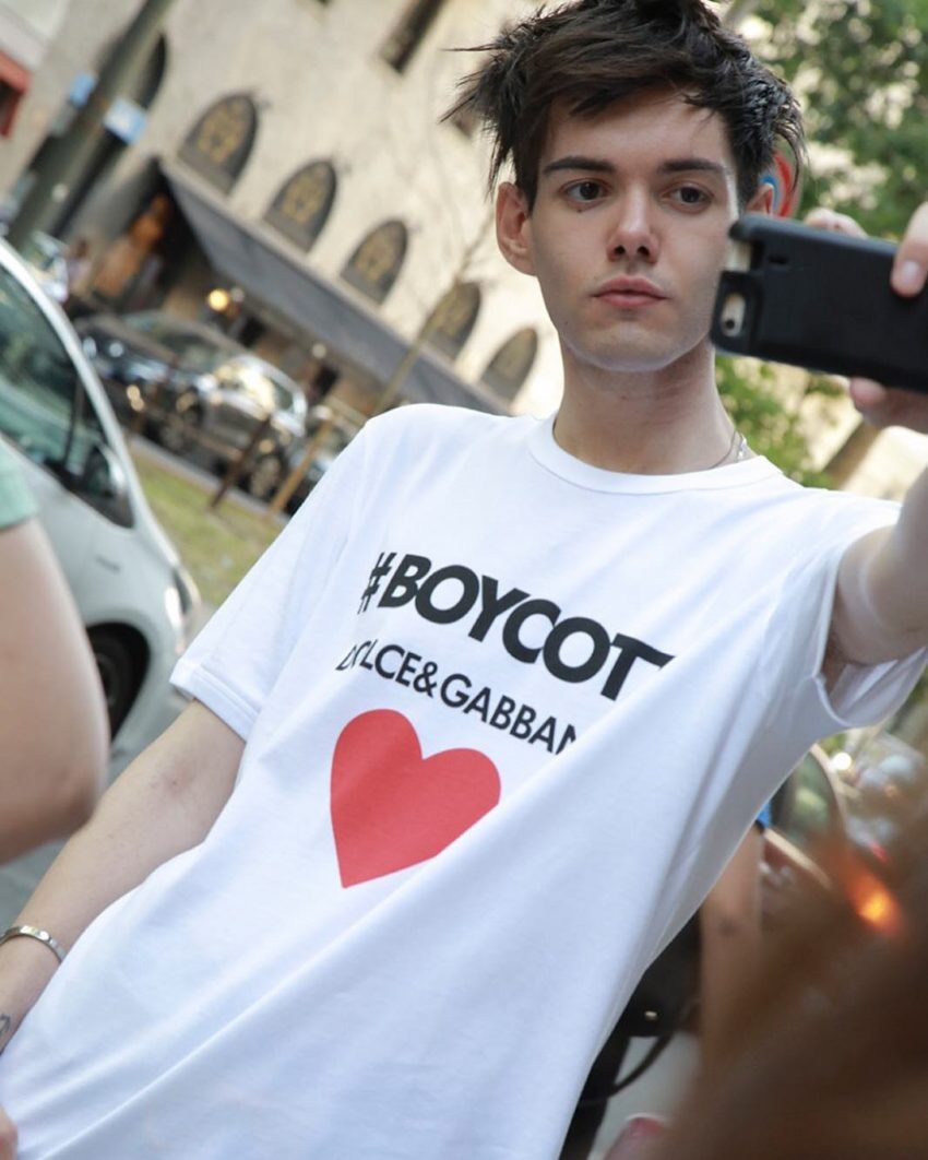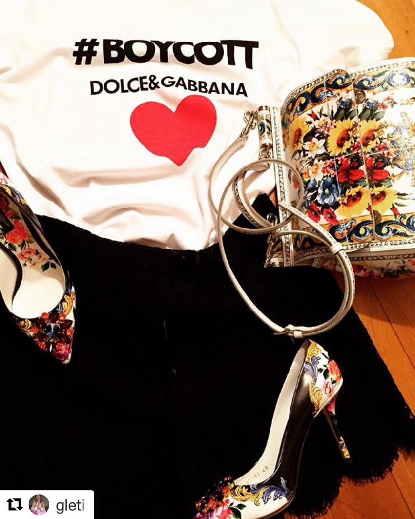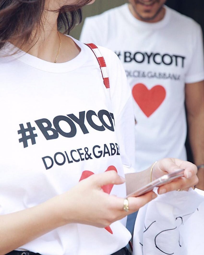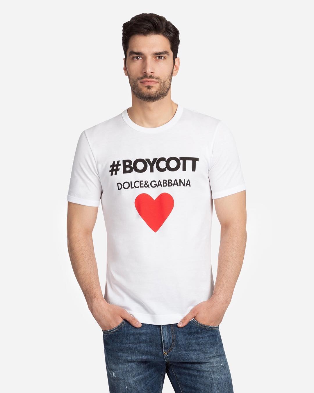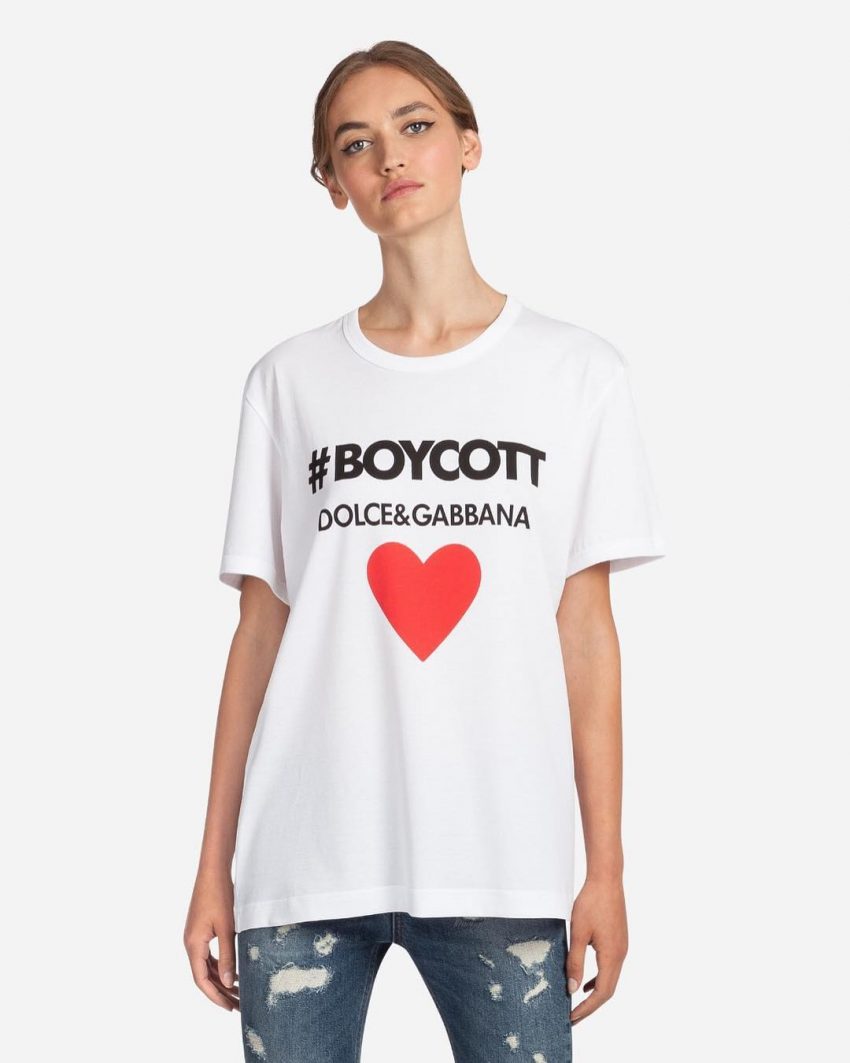 Pois fartos de boicotes, Stefano e Domenico decidiram criar uma t-shirt onde assumem isso tudo. É uma peça de roupa branca, simples, com a hashtag #boycott, o nome da maison e um coração vermelho, como que em género de provocação aos haters.