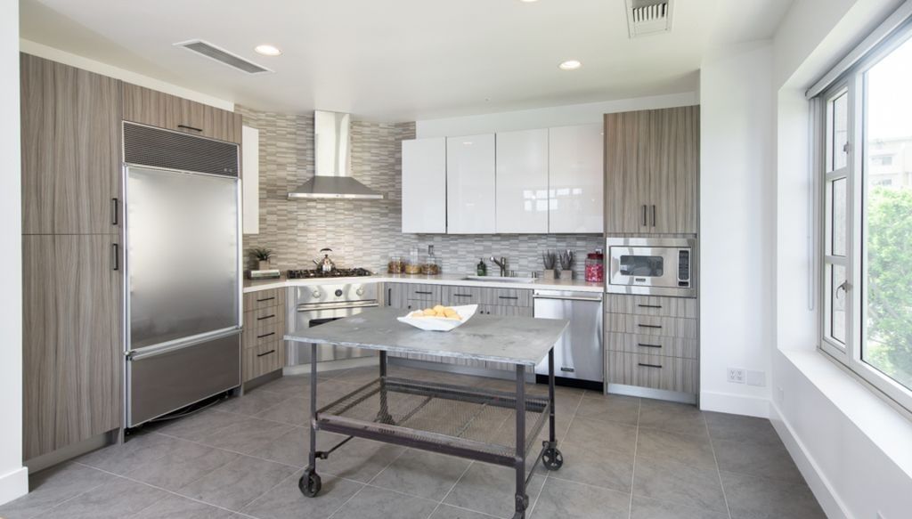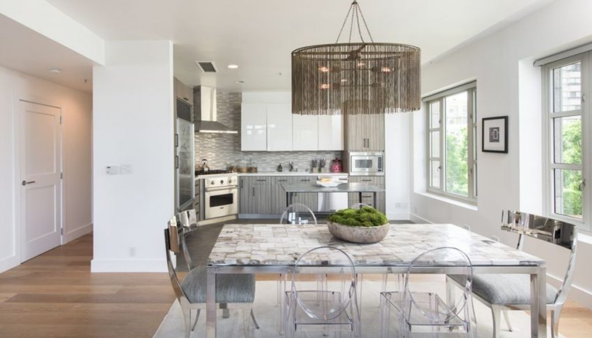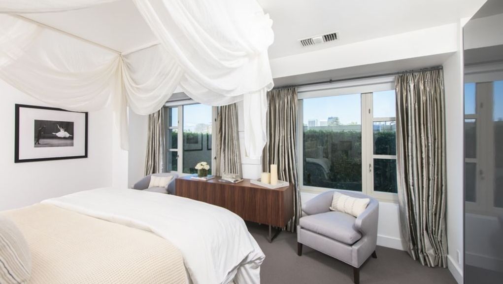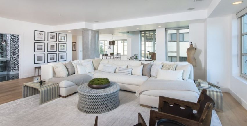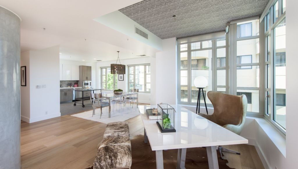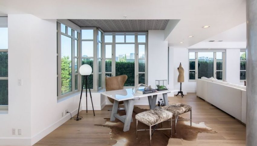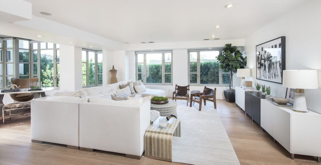 Localizado no corredor de Wilshire, o apartamento tem 2068 pés quadrados (192,12 metros quadrados), com vistas para árvores, um jardim de esculturas e o horizonte da cidade. Enquanto as vistas exteriores são invejáveis, o interior é ainda mais.