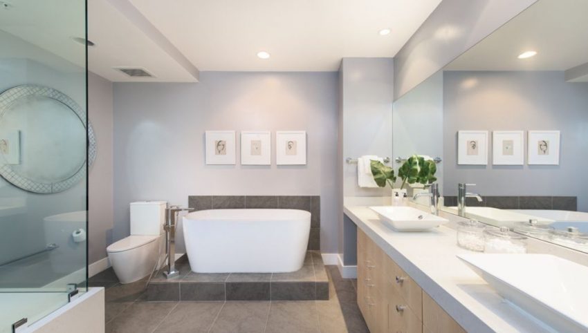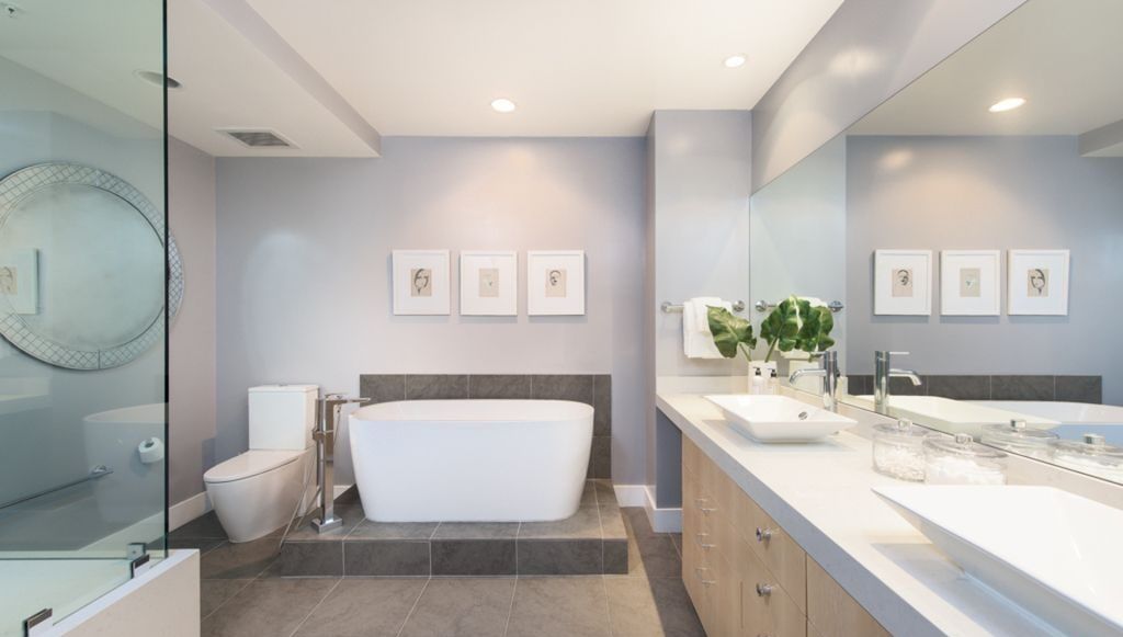 A residência de dois quartos e três casas-de-banho é espaçosa, graças aos tetos altos, muita iluminação natural e um espaço aberto. A paleta de cores varia entre o bege, branco, cinza e lavanda pálida.