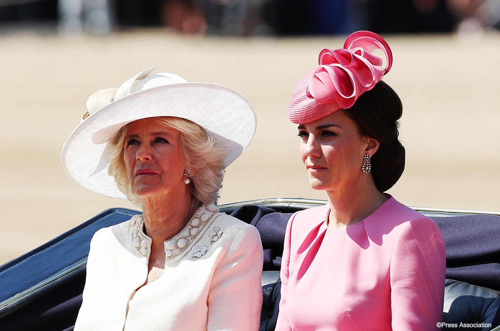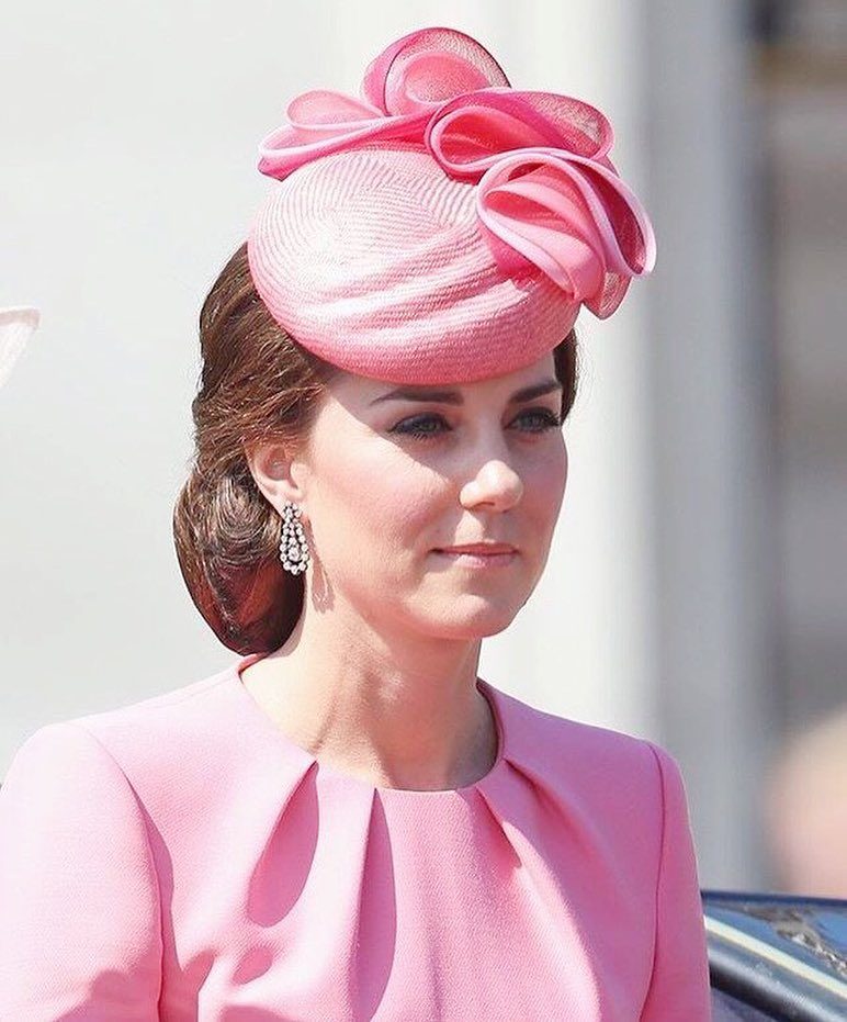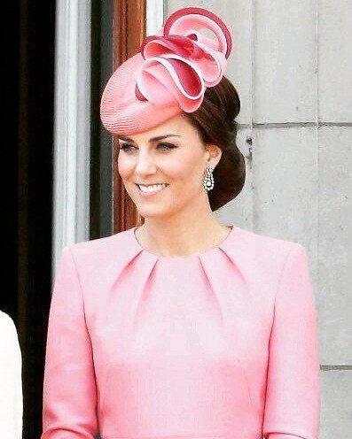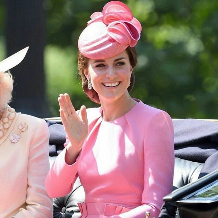 Kate Middleton, que seguia lado a lado com Camilla, optou por usar um conjunto rosa de Sarah Burton para Alexander McQueen com um chapéu de Jane Taylor, clutch de Etui e brincos de diamantes da Rainha.