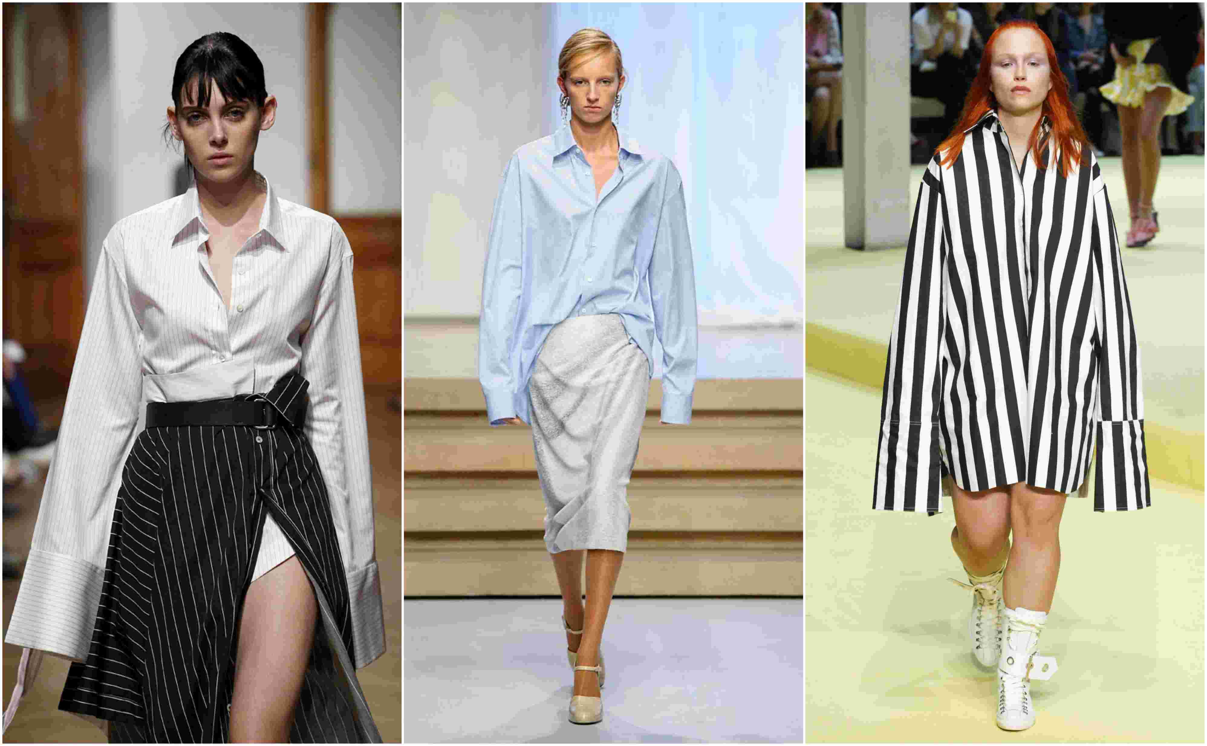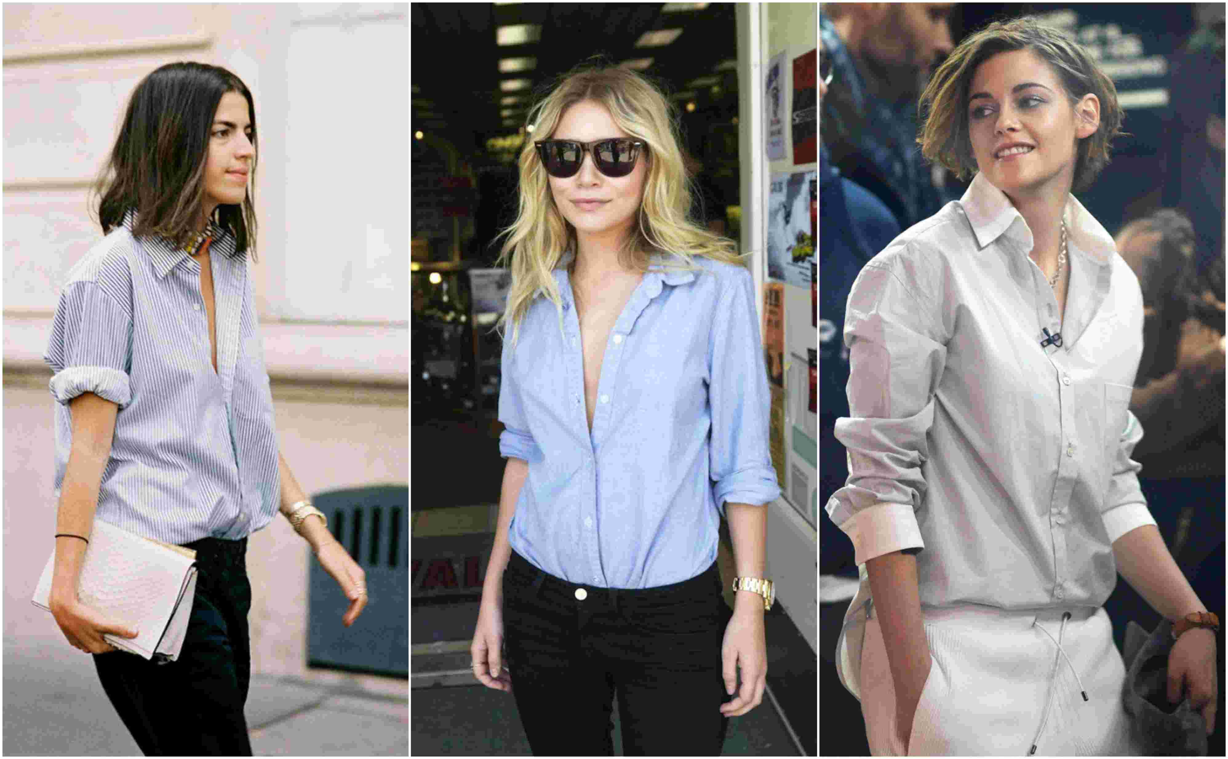 Outra tendência é deixar um ou os dois ombros destapados. Pegando na camisa clássica Oxford (o estilo típico de uma camisa de homem), desabotoa-se os primeiros botões e deixa-se cair a peça sobre o(s) ombro(s).