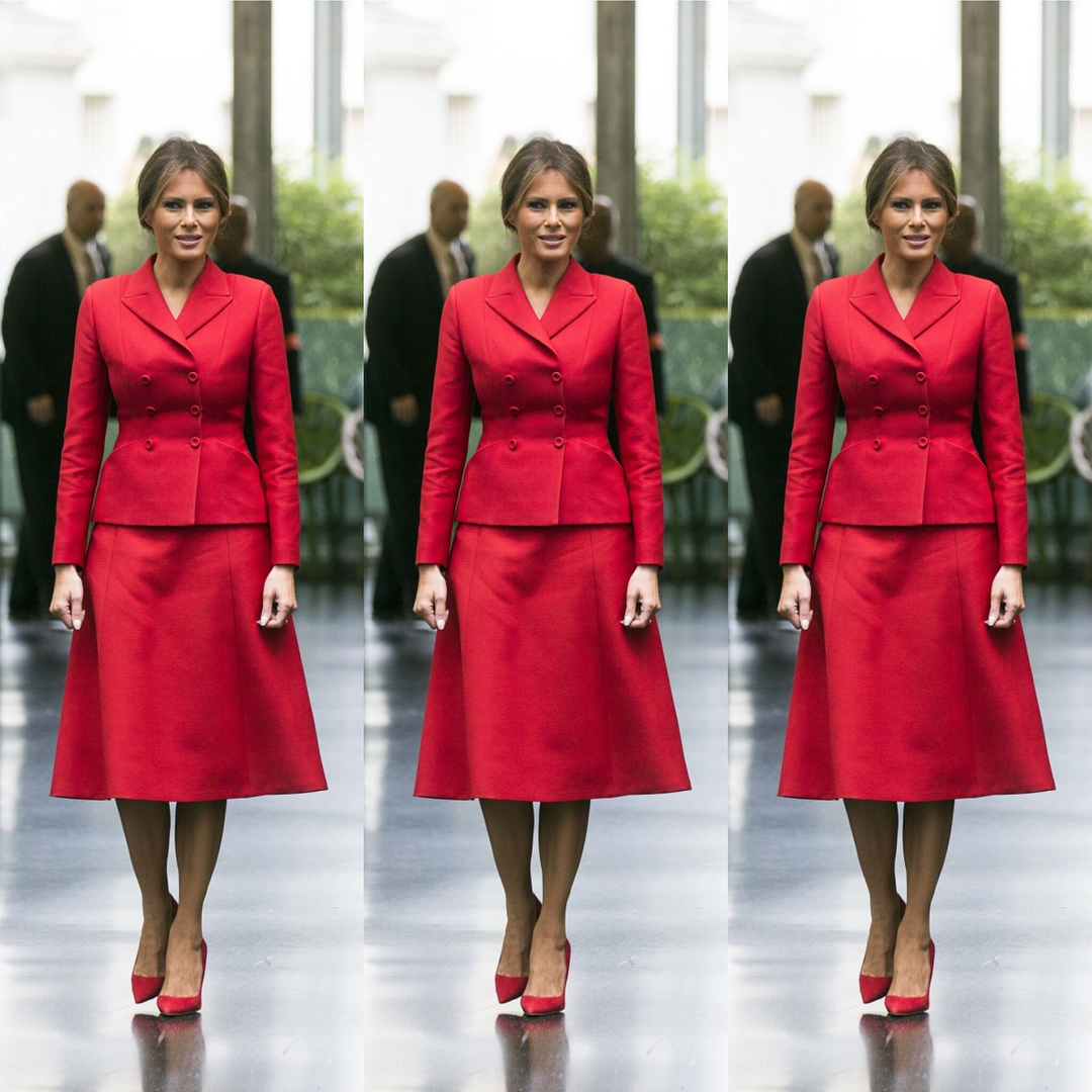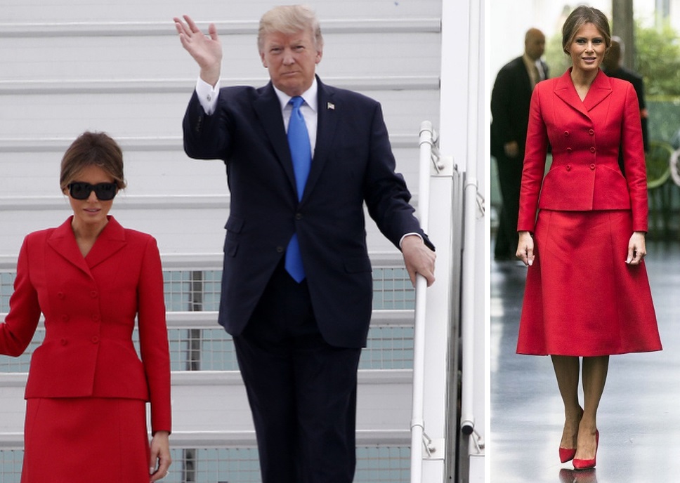 Melania Trump, de 47 anos, arrasou ao sair do avião com uma versão mais moderna do fato Christian Dior, do estilista Hervé Pierre, um dos favoritos da mulher de Donald Trump. Constituído por um casaco e uma saia, ambos de cor vermelha, o conjunto tornou-se rapidamente elogiado nas redes sociais.