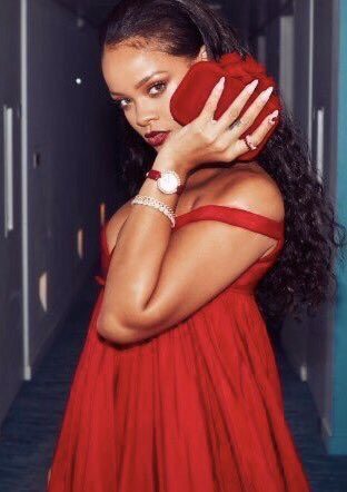 A intérprete de ‘Diamonds’ conjugou o look com uma clutch Jimmy Choo da mesma cor e joias igualmente encarnadas de Chopard. Os lábios tinham batom vermelho.