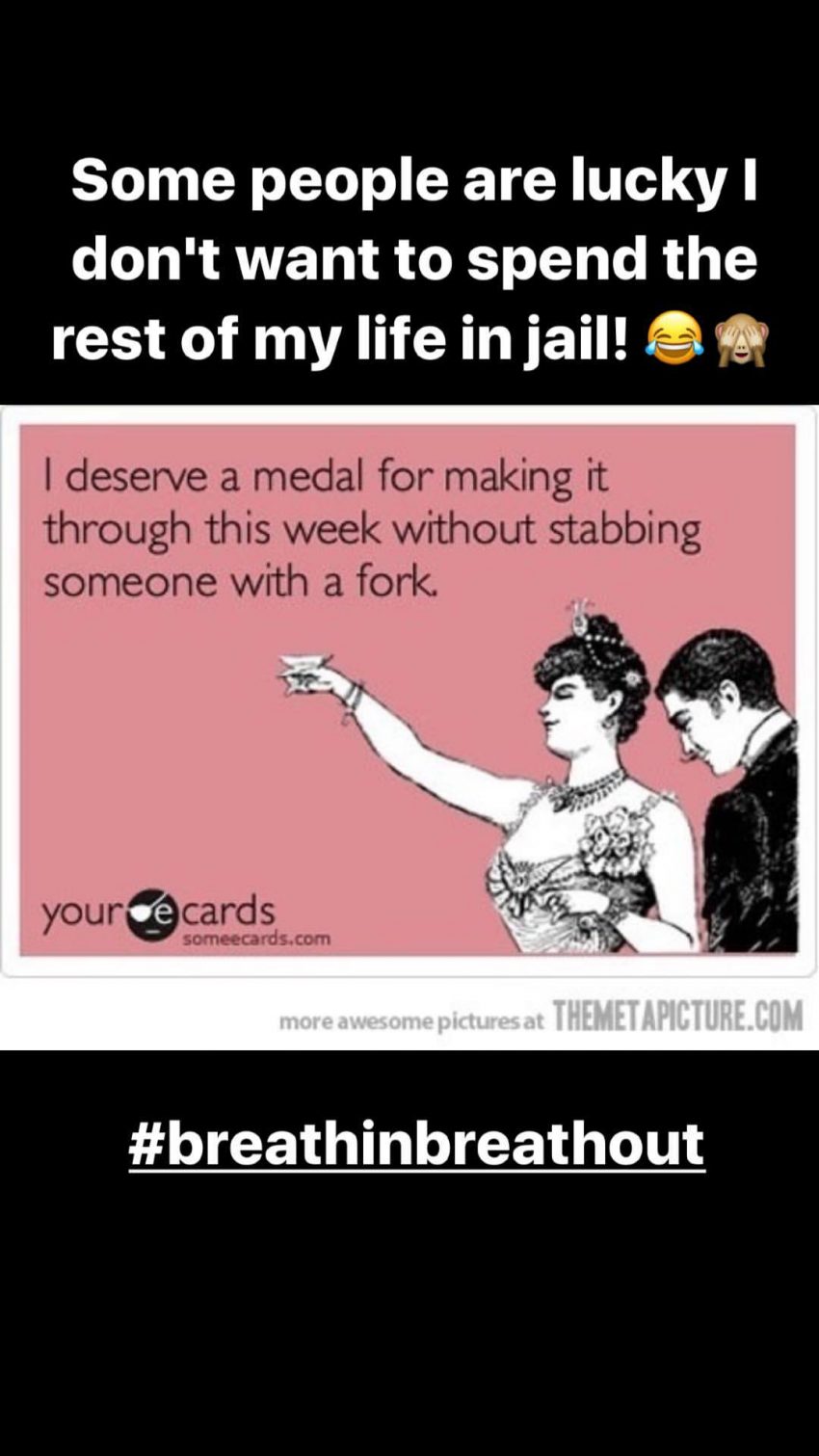 O ‘anjo’ da Victoria’s Secret reagiu com sorrisos à situação que a perturba, mas eles vieram carregados de ironia e com uma ameaça à boleia. “A sorte de algumas pessoas é que eu não quero passar o resto da minha vida na cadeia. Inspira, expira”, acrescentou a própria a um ‘meme’ que reza assim: “Eu mereço uma medalha por ter passado a semana sem esfaquear alguém com um garfo”.