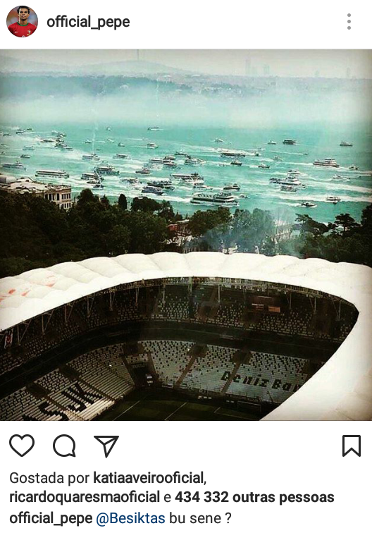 O internacional português assinou um contrato válido por duas épocas no clube onde também joga o colega e amigo, Ricardo Quaresma, que colocou um ‘gosto’ numa imagem partilhada ontem (4) por Pepe no Instagram, onde é possível ver-se o estádio do Beşiktaş. Também Katia Aveiro, irmã Cristiano Ronaldo, deixei o seu ‘gosto’ na referida fotografia.