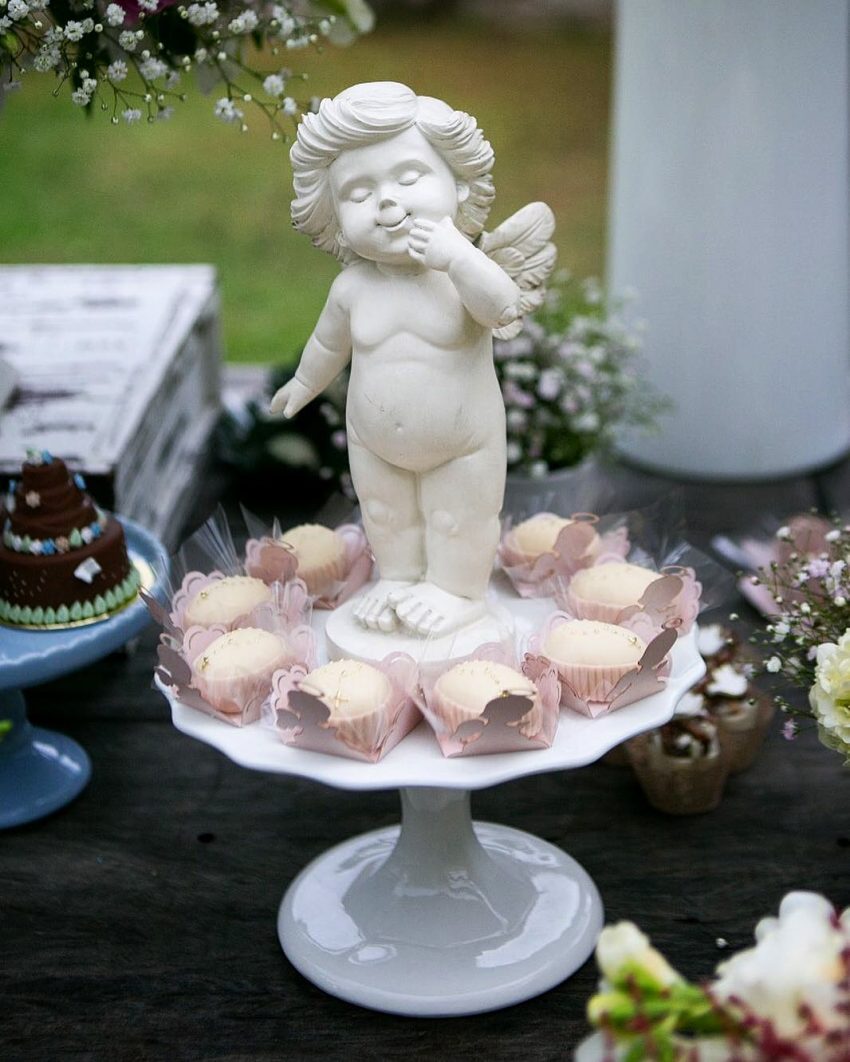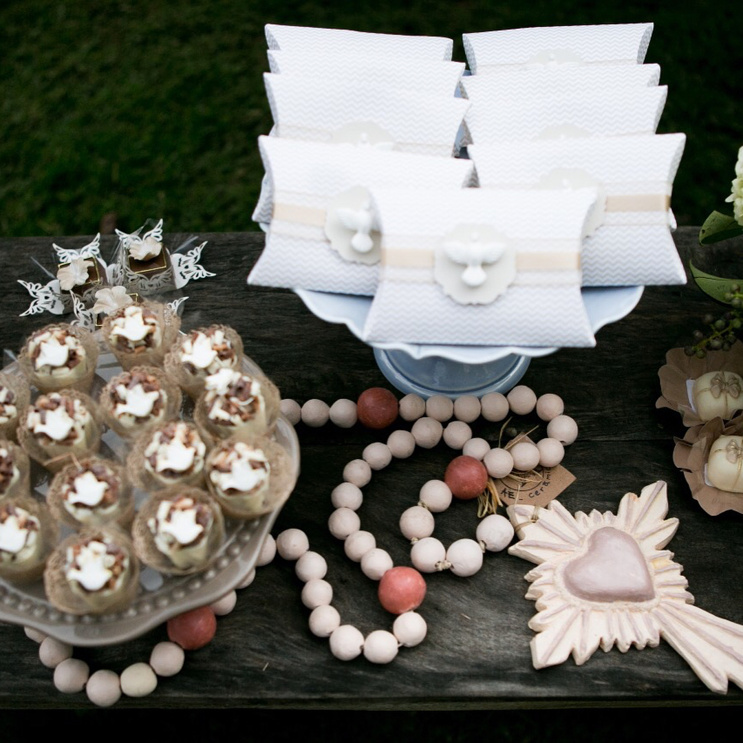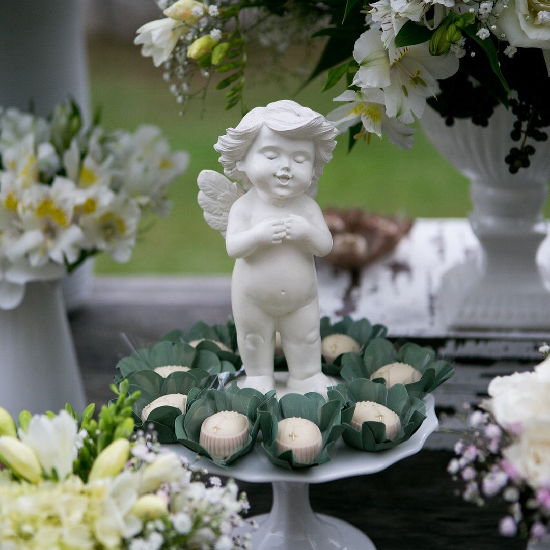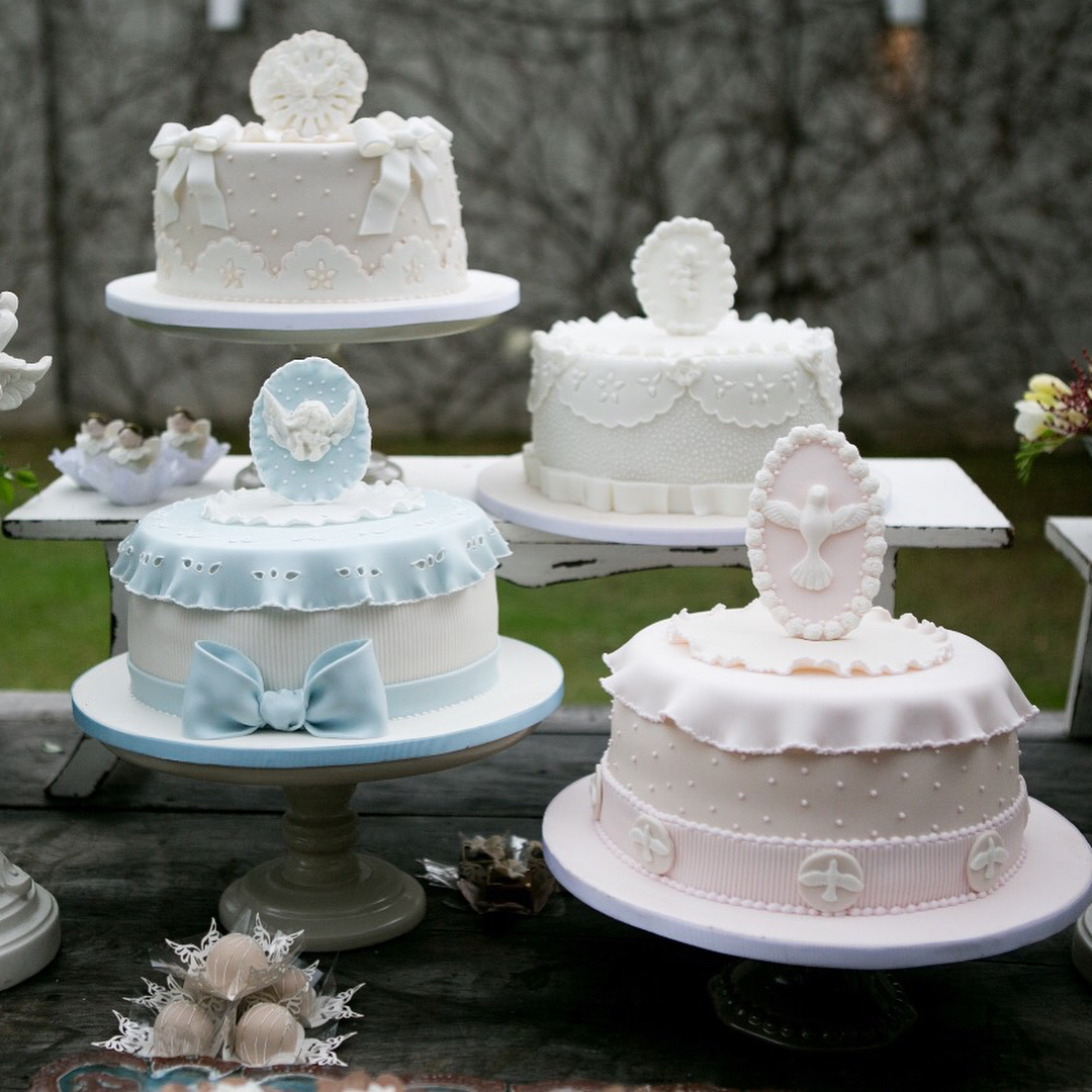 Por isso houve quatro bolos, quatro anjinhos abençoados e muito mais numa mesa decorada a preceito para a ocasião. Veja as fotos: