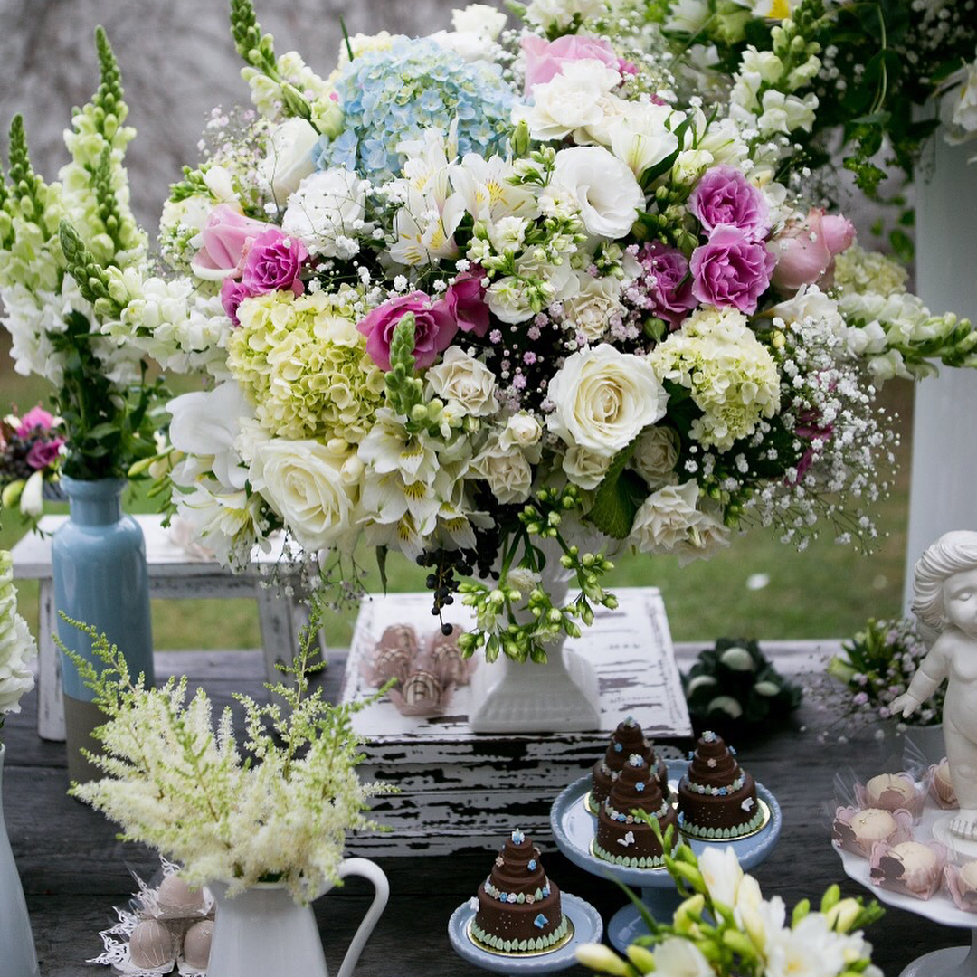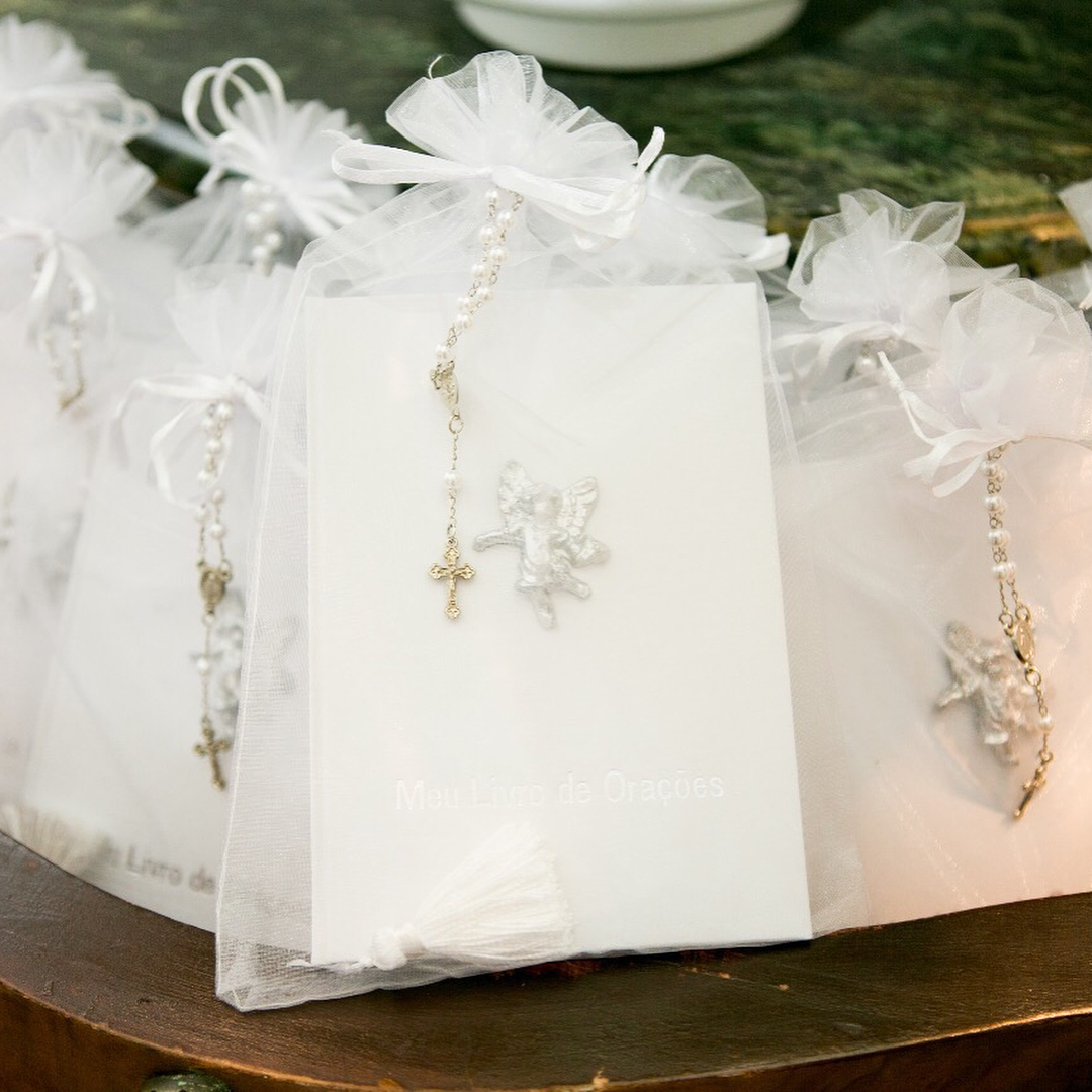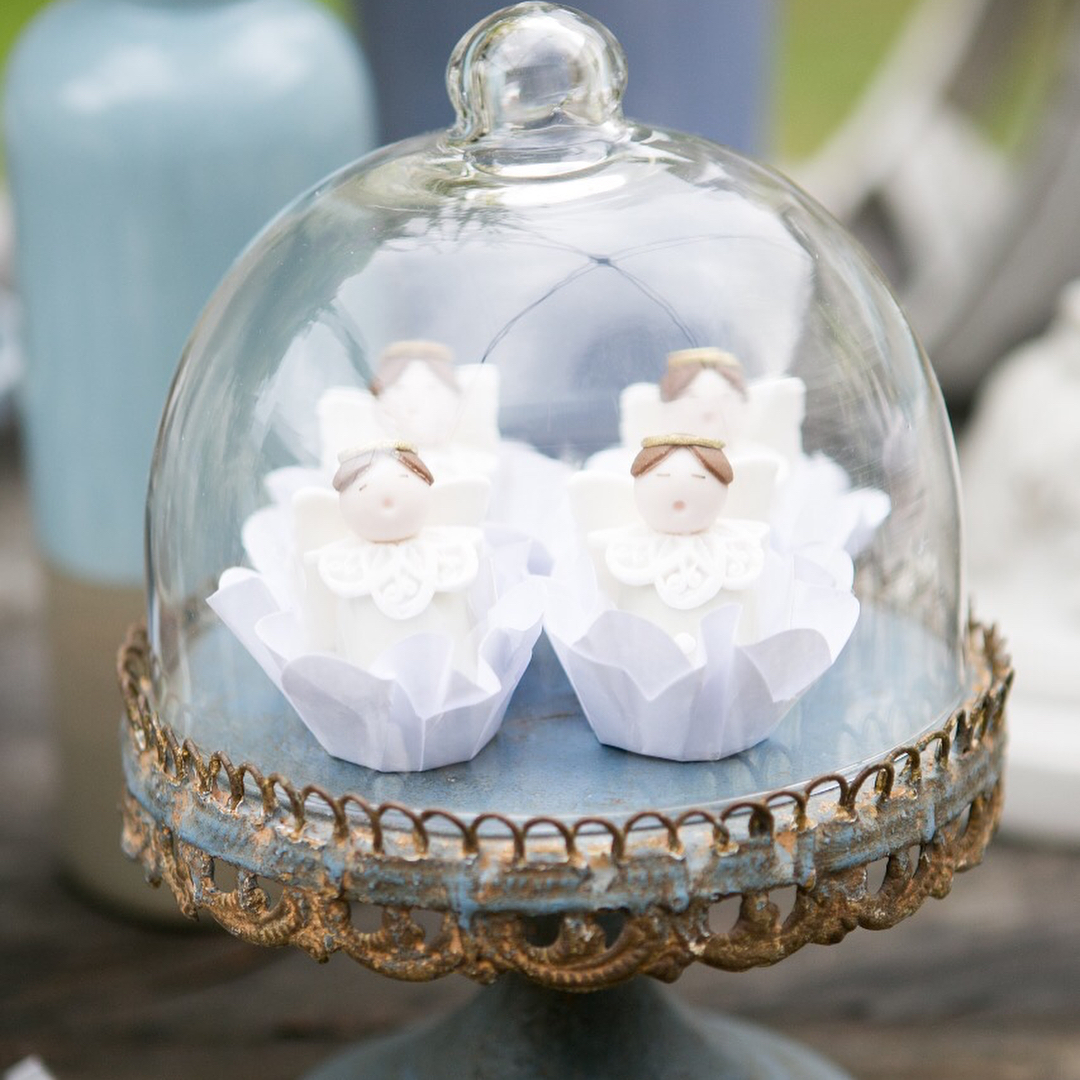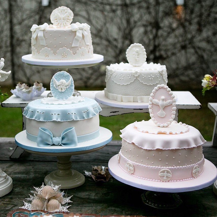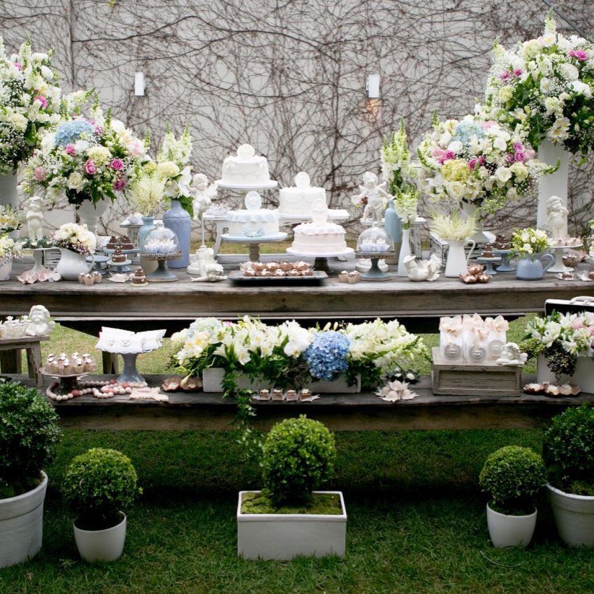 Por isso houve quatro bolos, quatro anjinhos abençoados e muito mais numa mesa decorada a preceito para a ocasião. Veja as fotos: