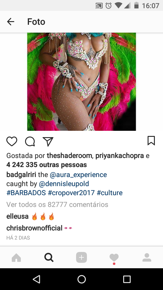 Agora parecem ter-se reaproximado. Ou pelo menos ele tentou isso, já que foi comentar esta imagem de Rihanna no festival Crop Over, celebração tradicional de Barbados, seu país natal.