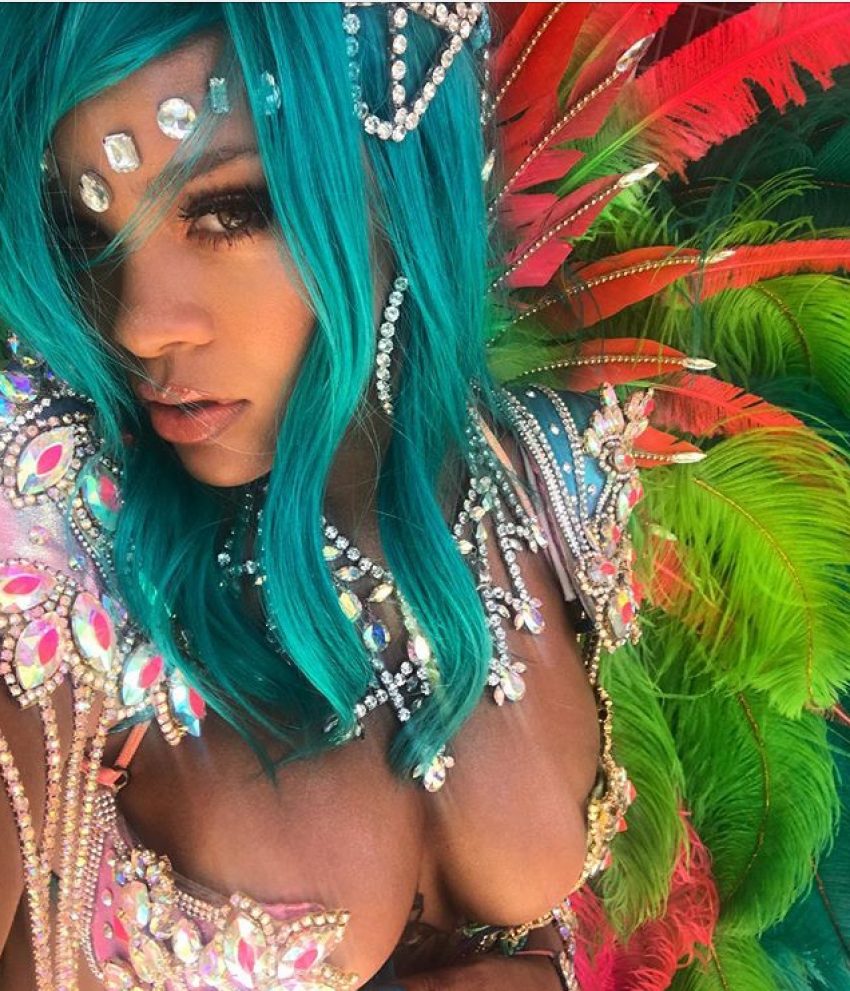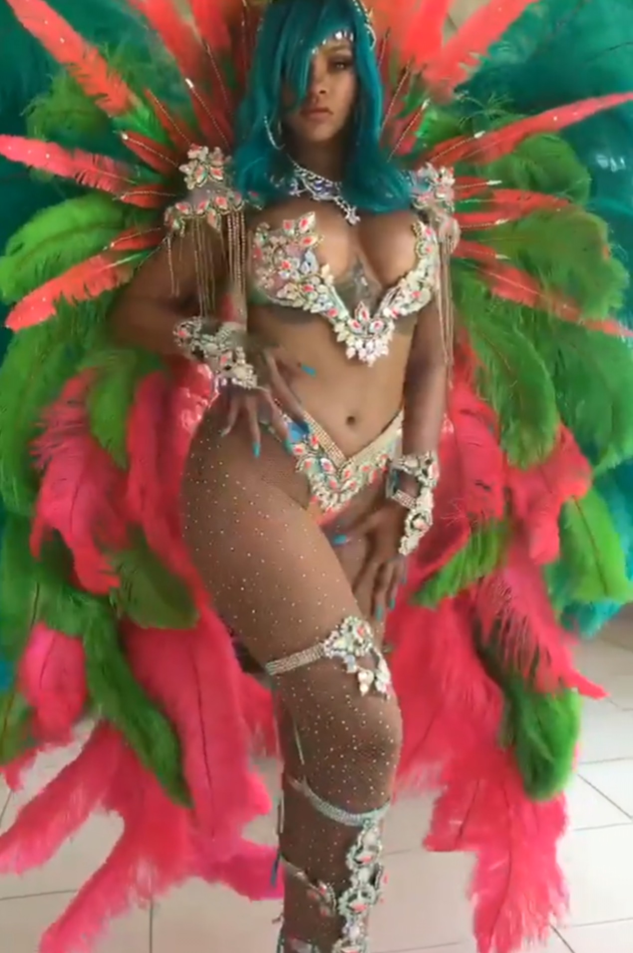 Ousada, com pouca roupa, mas muitos brilhos e plumas, a cantora causou furor na terra natal. Com formas mais arredondadas, Rihanna criou entre os seguidores nas redes sociais a suspeita de que pode estar grávida.